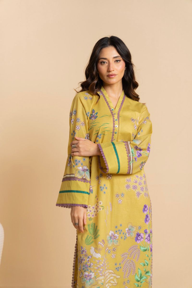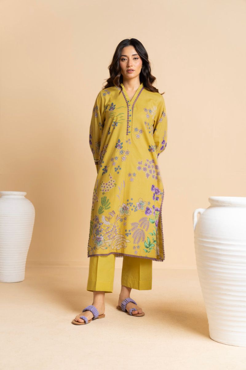 Plum 100% Cotton Lawn Rust Colour Printed Yellow Flowers Embroidered Yellow threads On Stitched 2 pc suit for Girls.