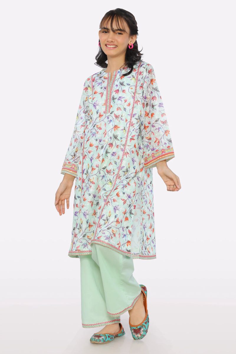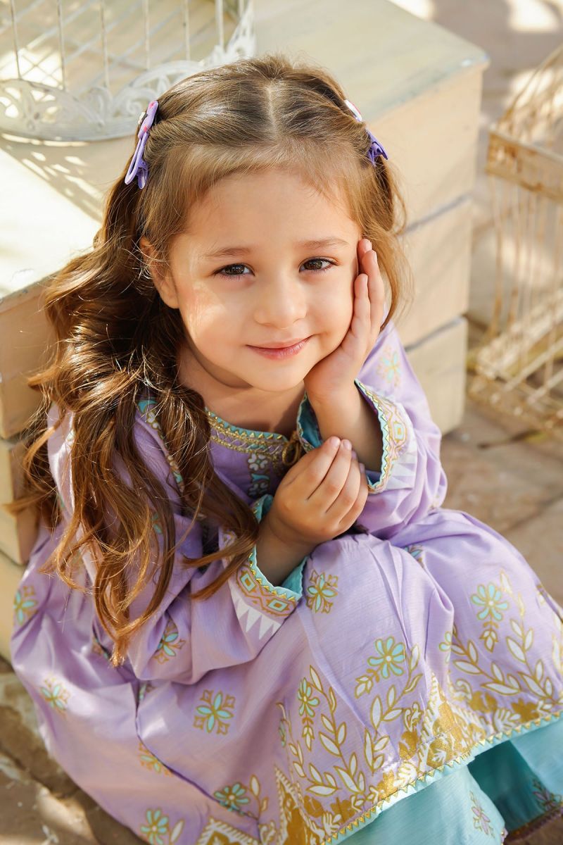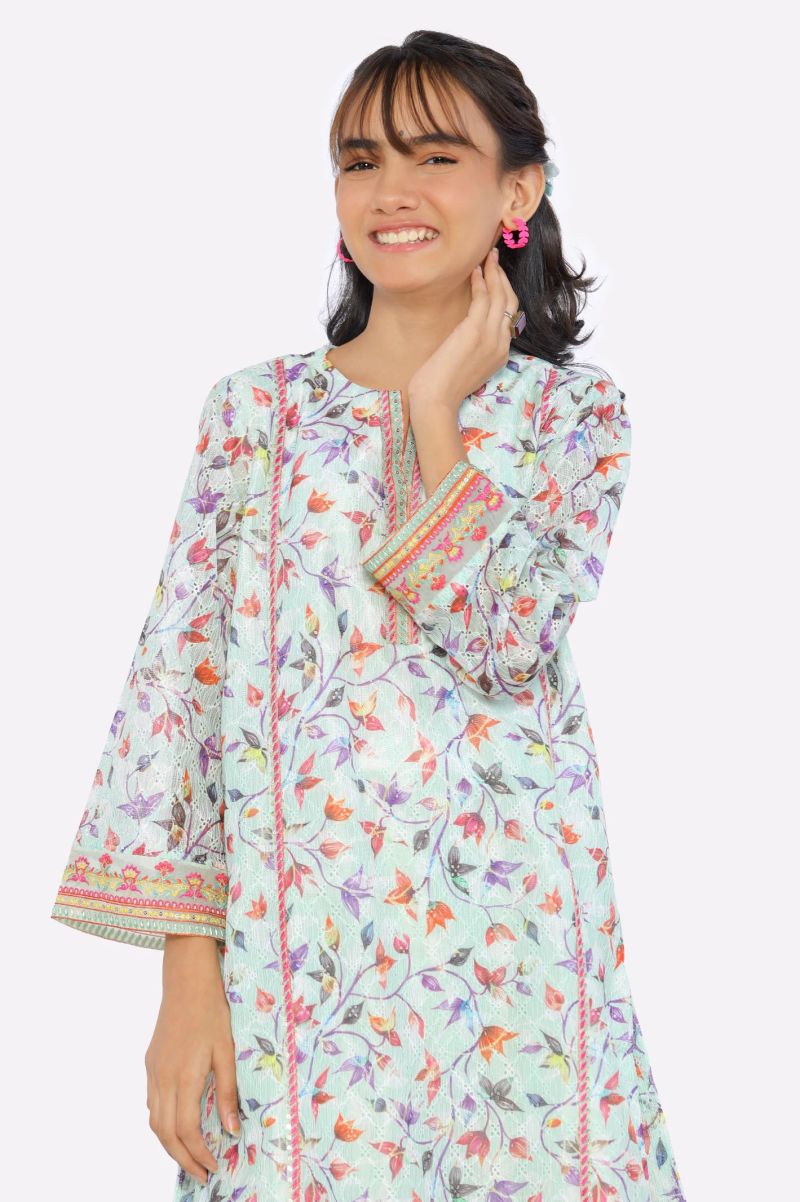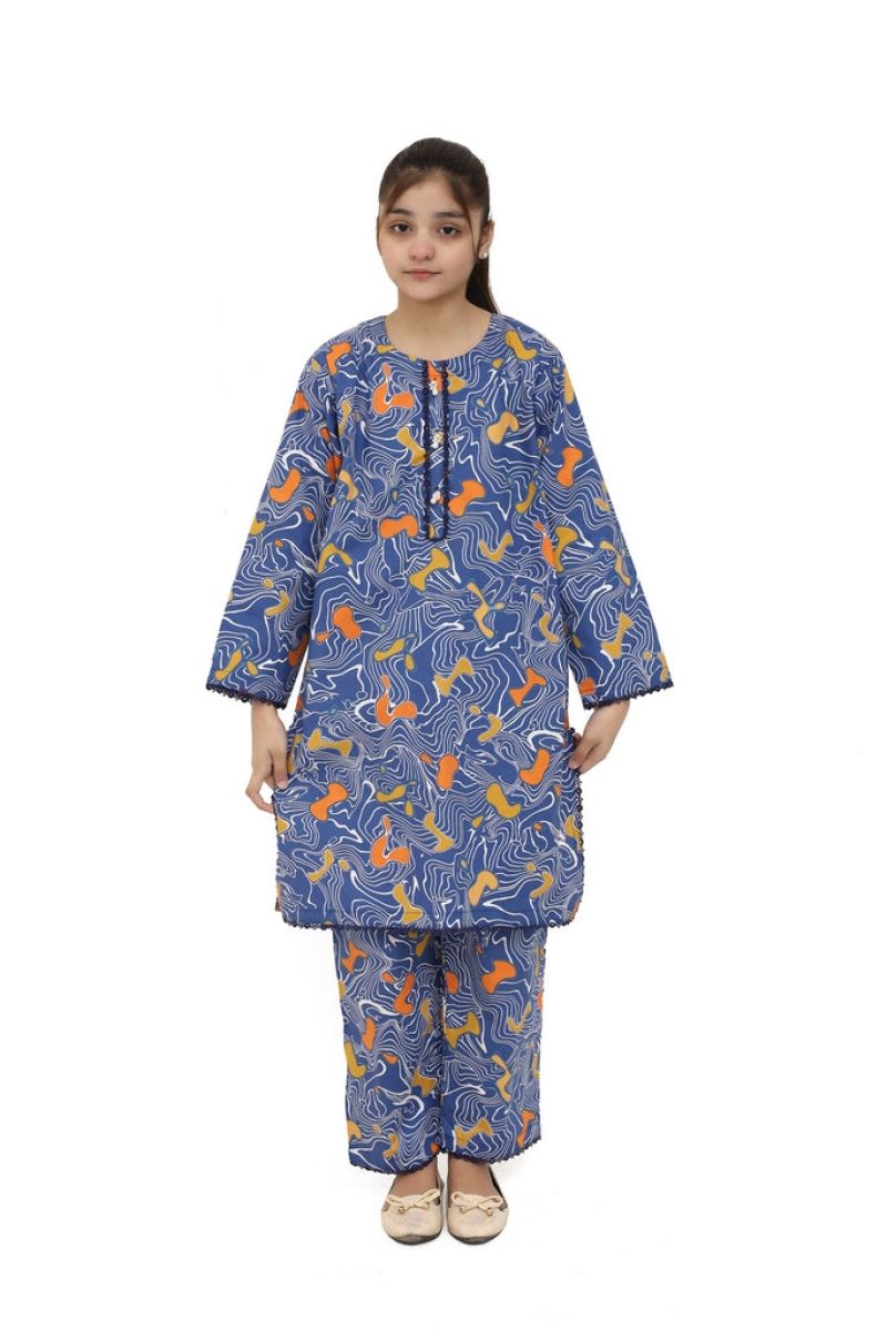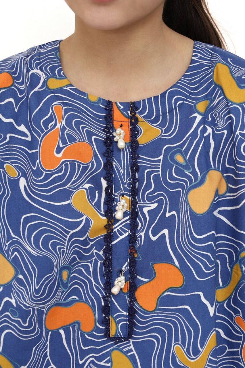 Plum Digital Cotton Lawn Blue Colour Printed Yellow Orange White Patterns Embelished White Tassels Blue Laces on 2 Pc stitched suit for Girls.