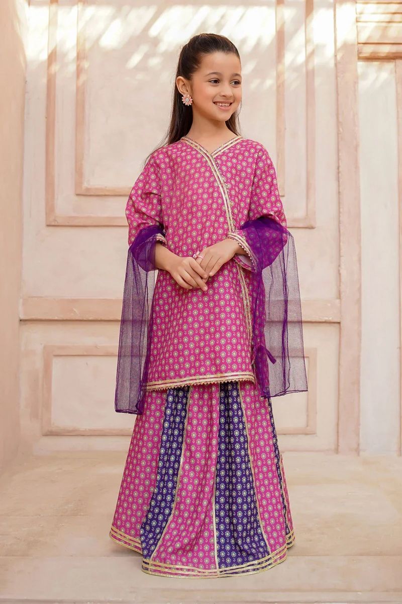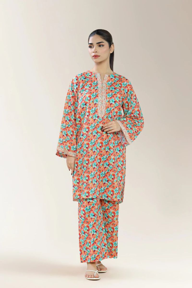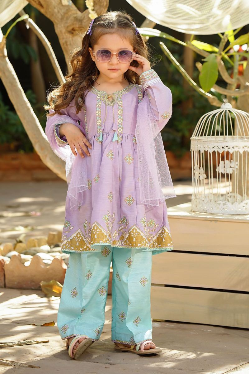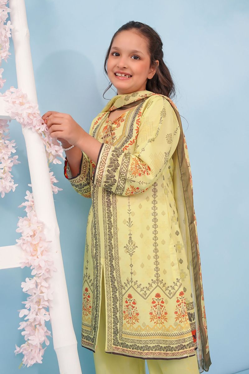 Plum Digital Cotton Lawn Blue Colour Printed Yellow Orange White Patterns Embelished White Tassels Blue Laces on 2 Pc stitched suit for Girls.