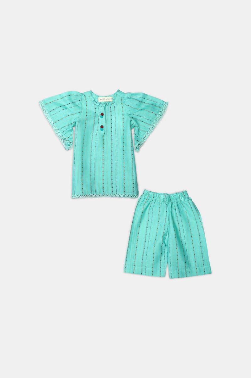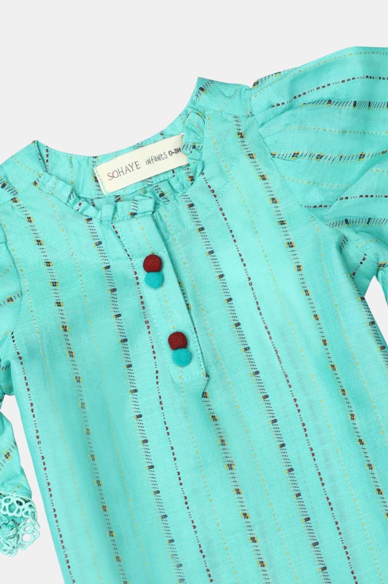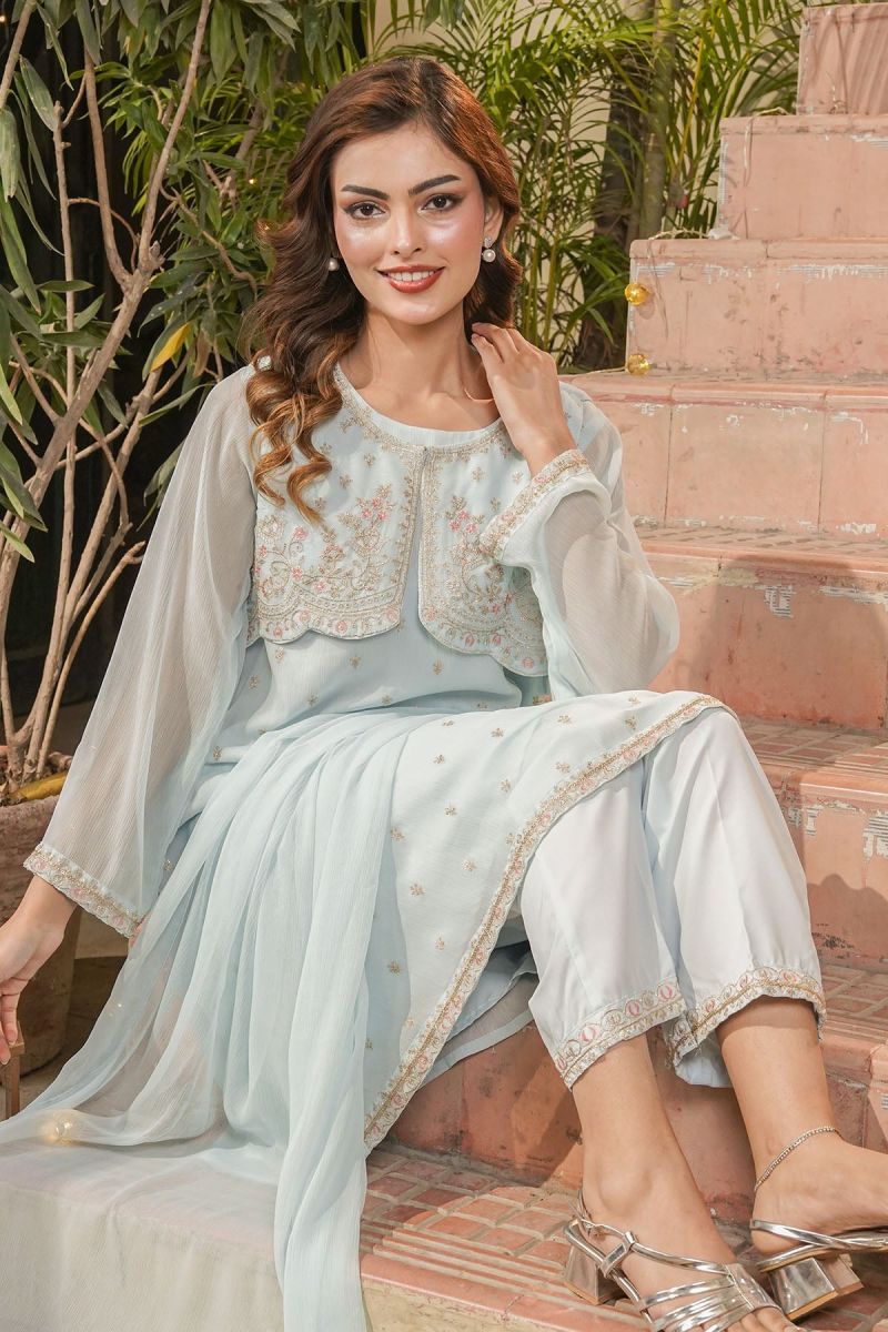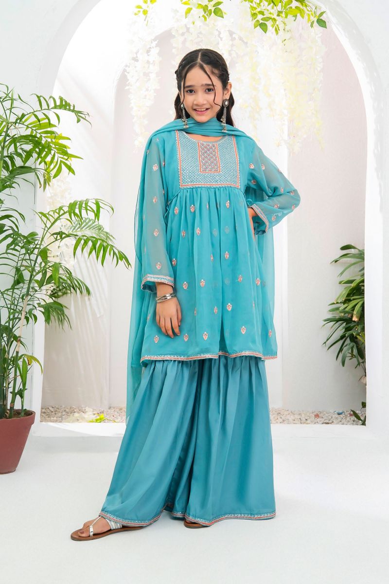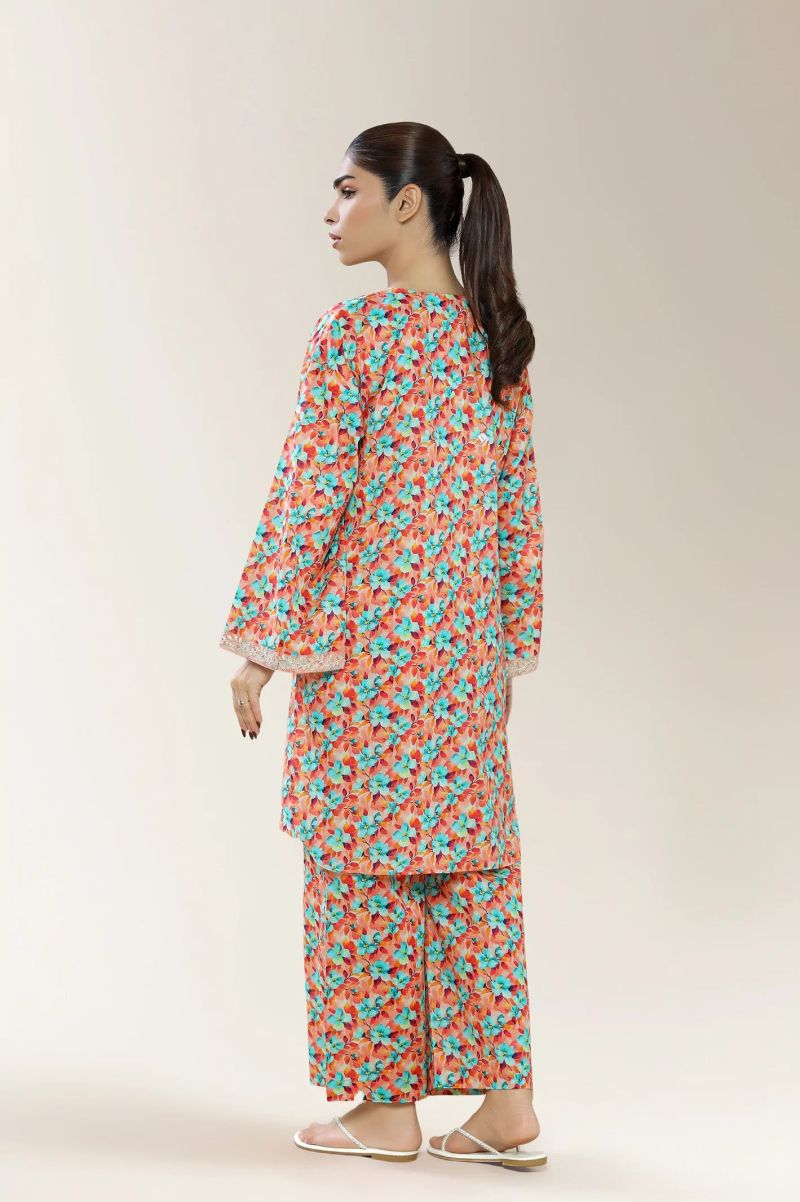 Plum Digital Cotton Lawn Blue Colour Printed Yellow Orange White Patterns Embelished White Tassels Blue Laces on 2 Pc stitched suit for Girls.