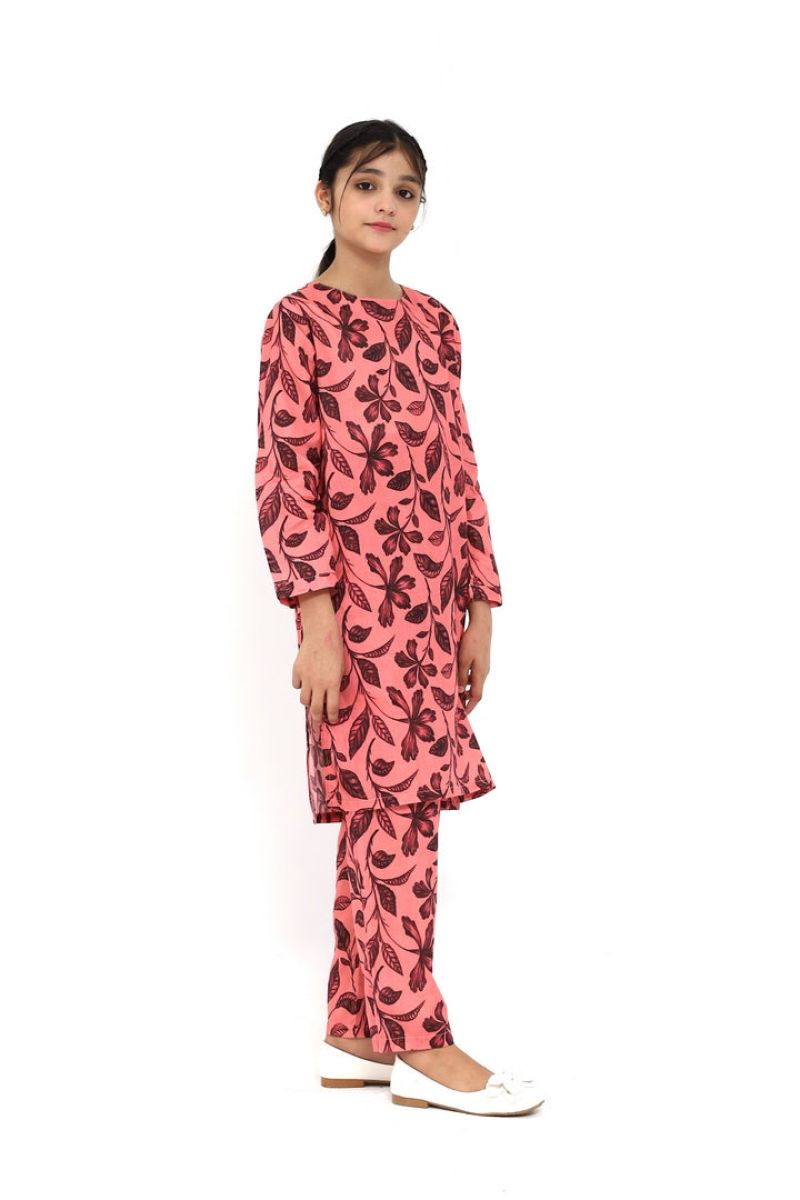 Plum Fine Lawn French Pink Colour Printed Black Leaves On 2 pc suit For Girls.