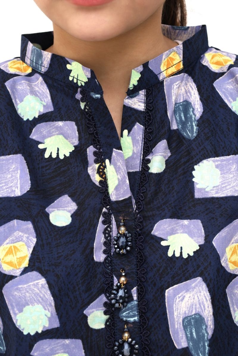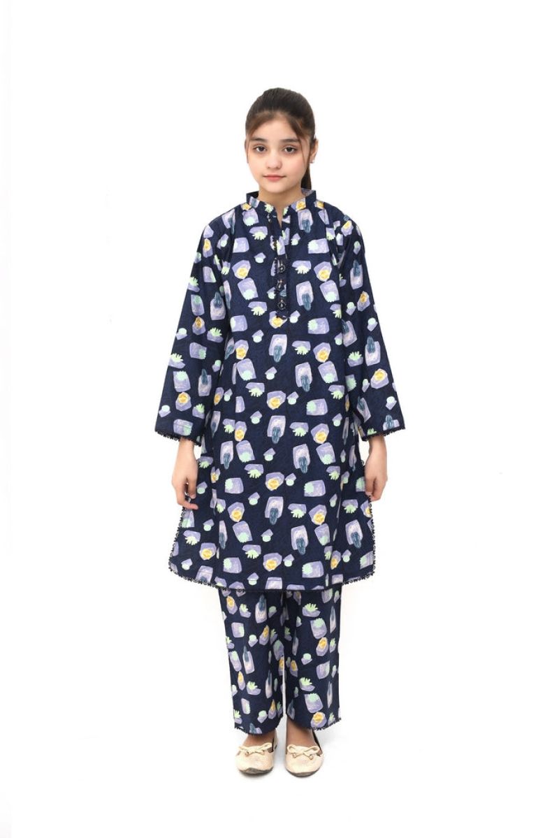 Plum Digital Cotton Lawn Blue Colour Printed Purple Green Yellow Patterns Embelished Blue Tassels & Laces on 2 Pc stitched suit for Girls.