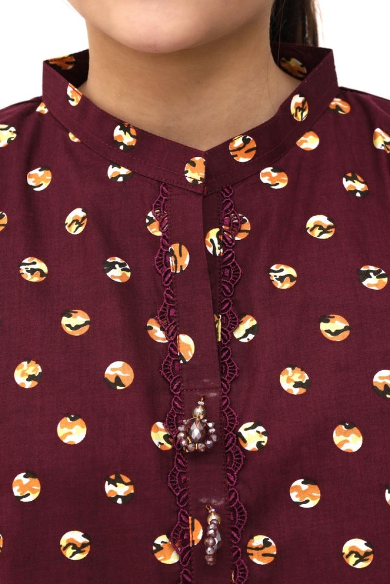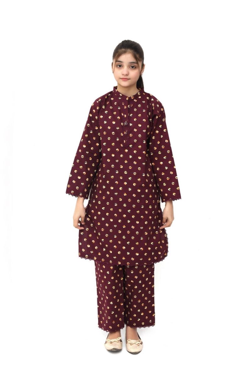 Plum Digital Cotton Lawn Brown Colour Printed Purple White Patterns Embelished Brown Tassels & Laces on 2 Pc stitched suit for Girls.