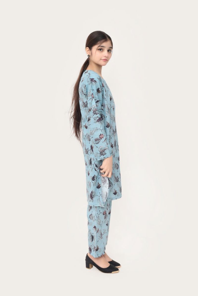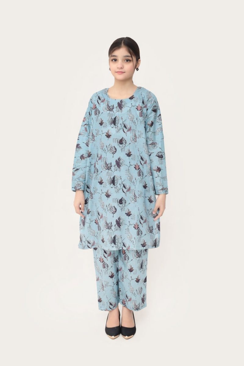Plum Digital Lawn Light Blue Colour Printed Black Grey Brown Leaves On 2 pc stitched suit For Girls.