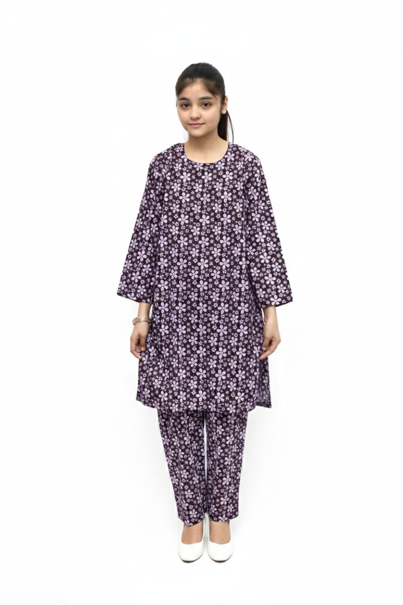 Plum Digital Lawn Dark Purple Colour Printed Light Purple Flowers on 2 Pc stitched suit for Girls.