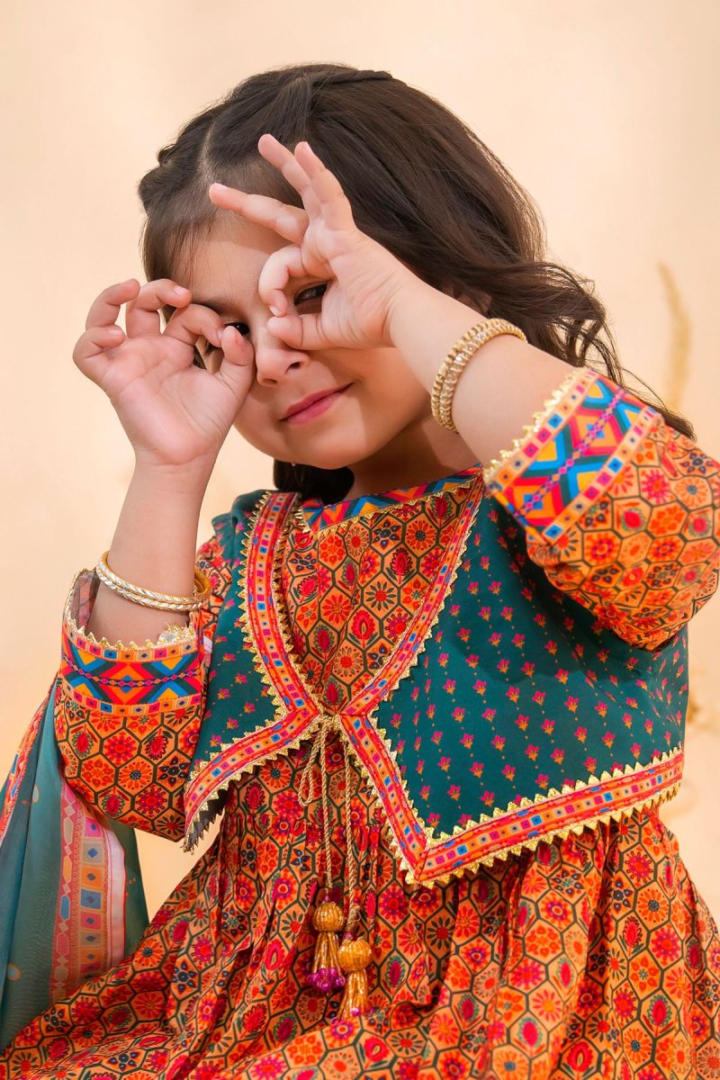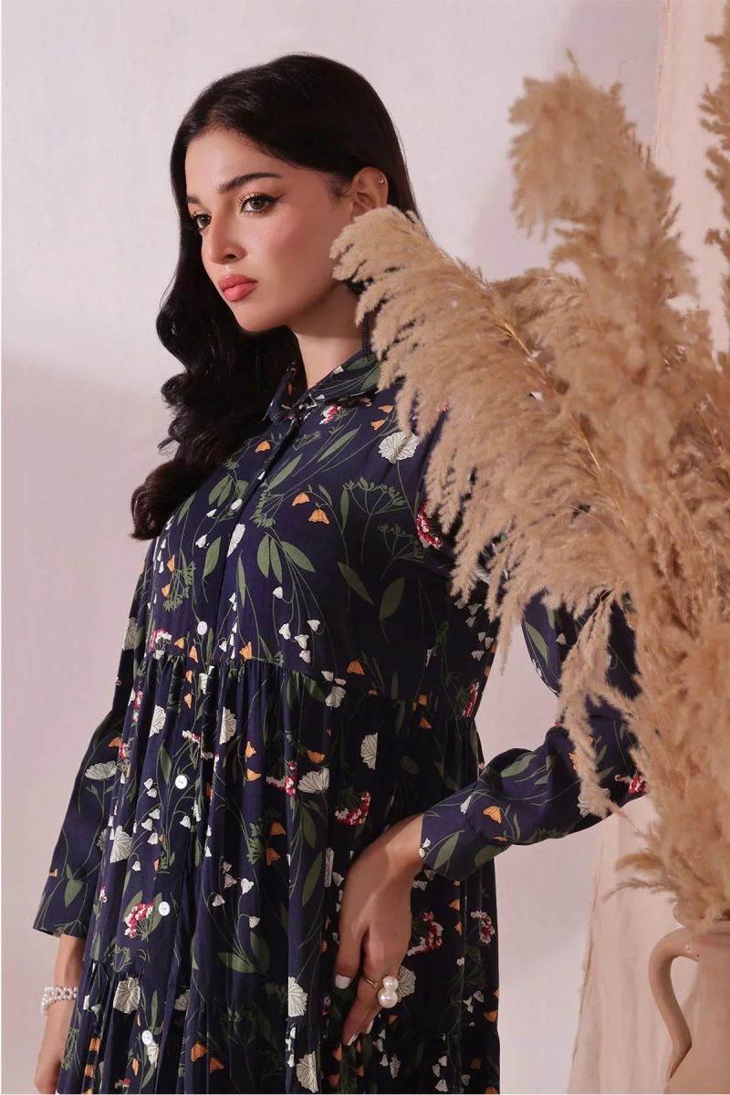 Plum Digital Lawn Olive Colour Printed Dark Blue Patterns on 2 Pc stitched suit for Girls.