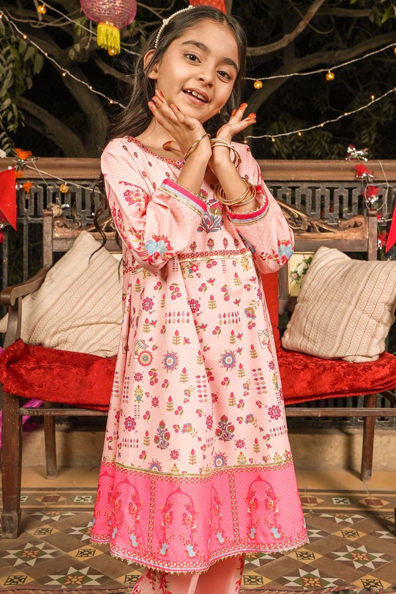 Plum Digital Cotton Lawn Peach Colour Printed Blue Purple Flowers Embelished Peach Tassels & Laces on 2 Pc stitched suit for Girls.