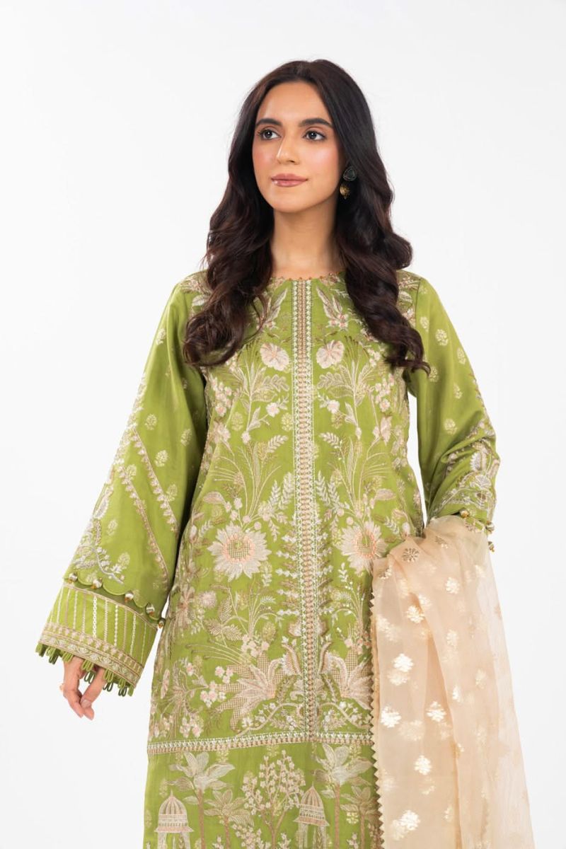 Plum Digital Cotton Lawn Green Colour Printed White Light Green Patterns Embelished Green Tassels & Laces on 2 Pc stitched suit for Girls.