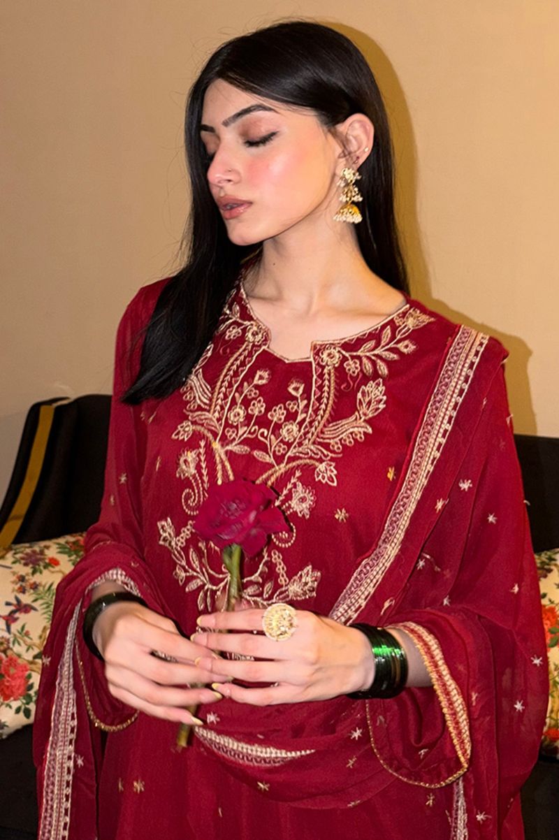 Embroidered Chiffon Maroon 3PC