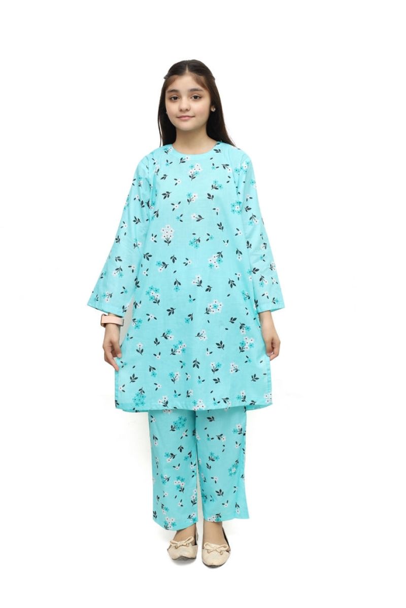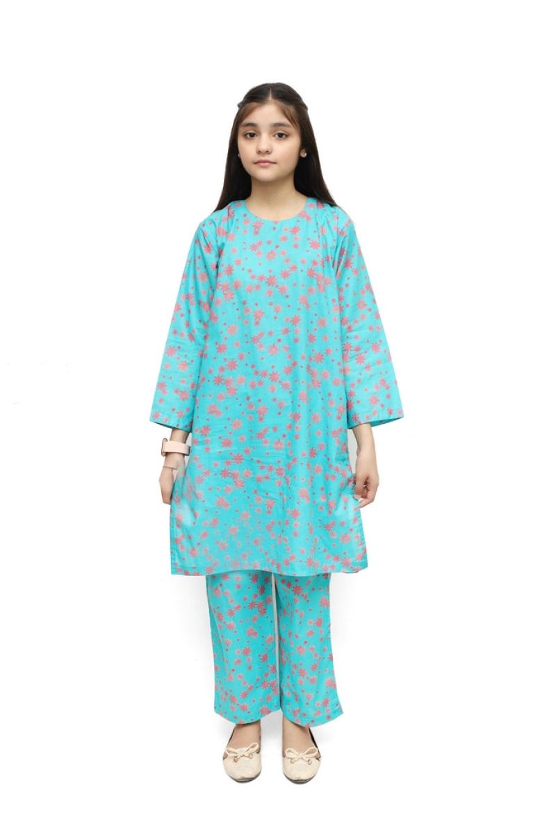 Plum Digital Lawn Sea Green Colour Printed Pink Flowers on 2 Pc stitched suit for Girls.