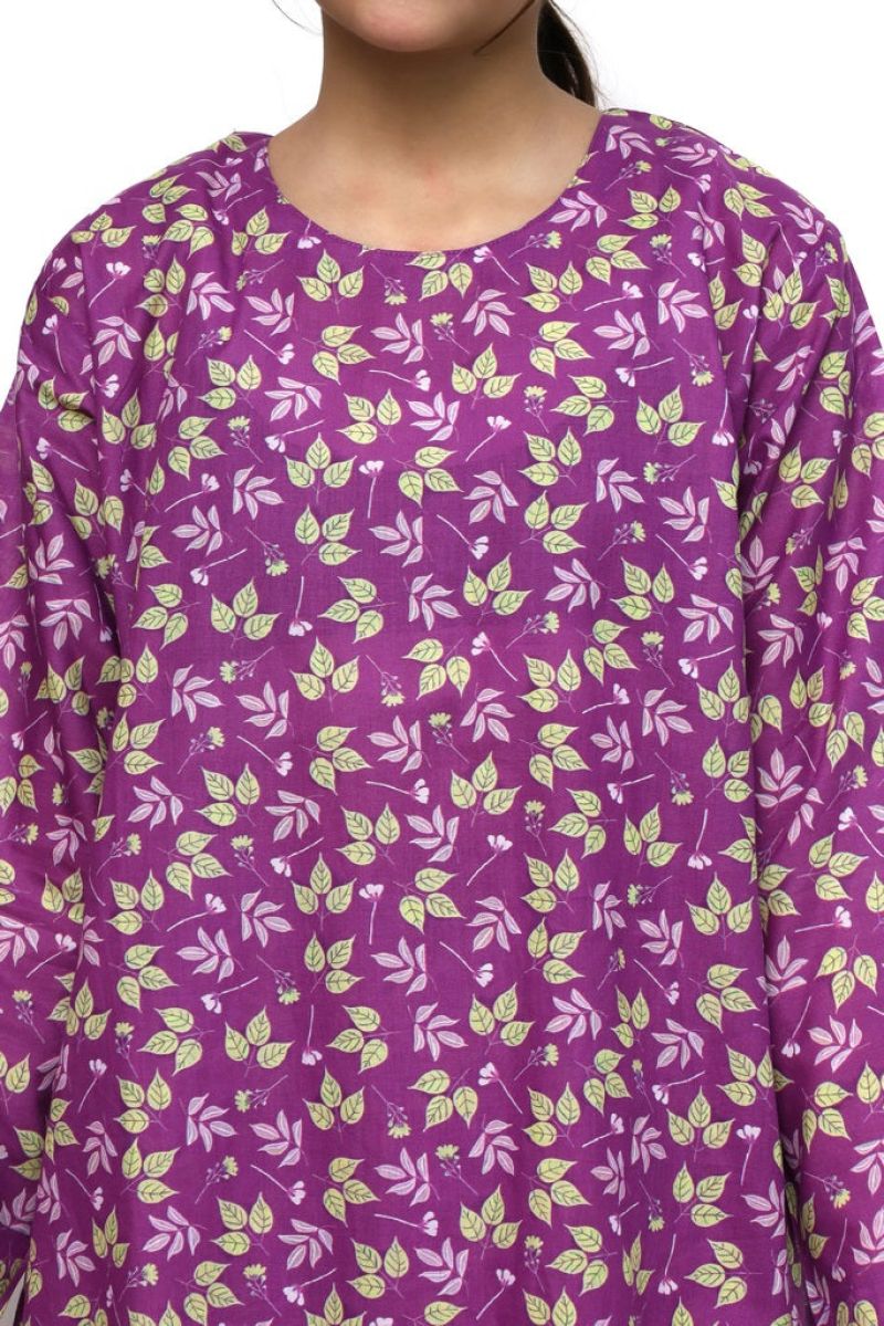 Plum Digital Lawn Purple Colour Printed Light Green Purple Leaves on 2 Pc stitched suit for Girls.