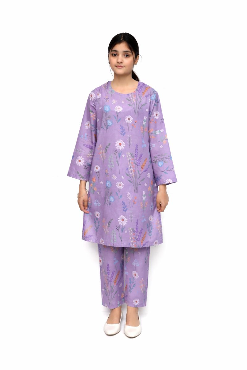 Plum Digital Lawn Lavender Colour Colurful Flowers on 2 Pc stitched suit for Girls