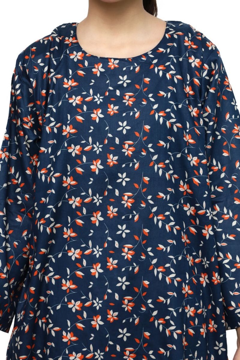 Plum Digital Lawn Dark Blue Colour Orange White Flowers on 2 Pc stitched suit for Girls