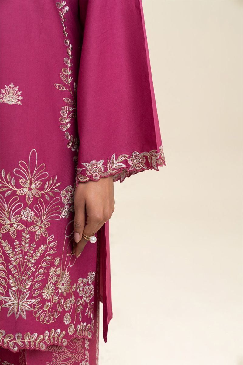 Plum 100% Cotton Lawn Dark Pink Colour Printed Grey Flowers Embroidered Light Pink threads On Stitched 2 pc suit for Girls.