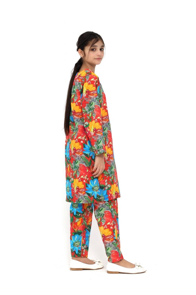 Plum Fine Lawn Red Carrot Colour Printed Blue Orange Flowers On 2 pc suit For Girls.