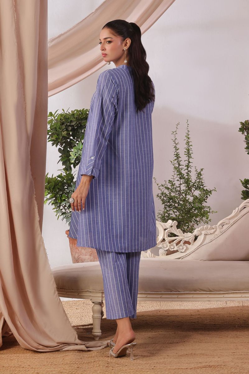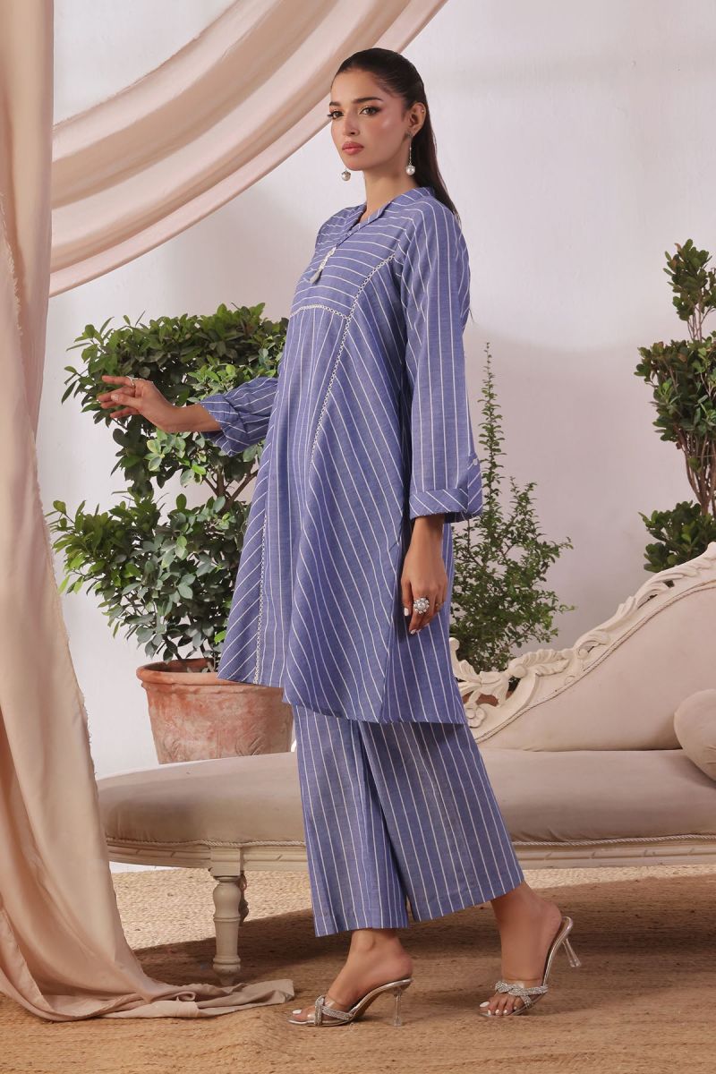 Top: Blue Self Printed Chambray Cotton Kurta With Crotia Laces
