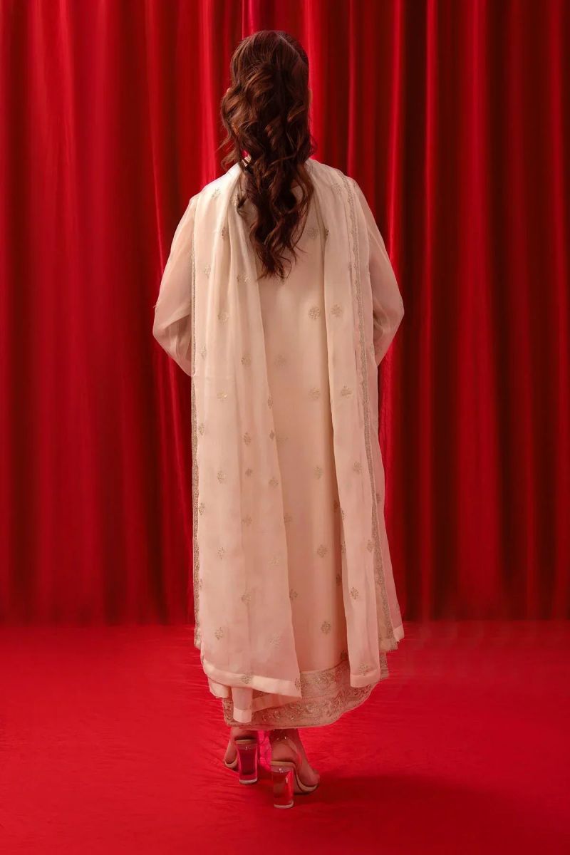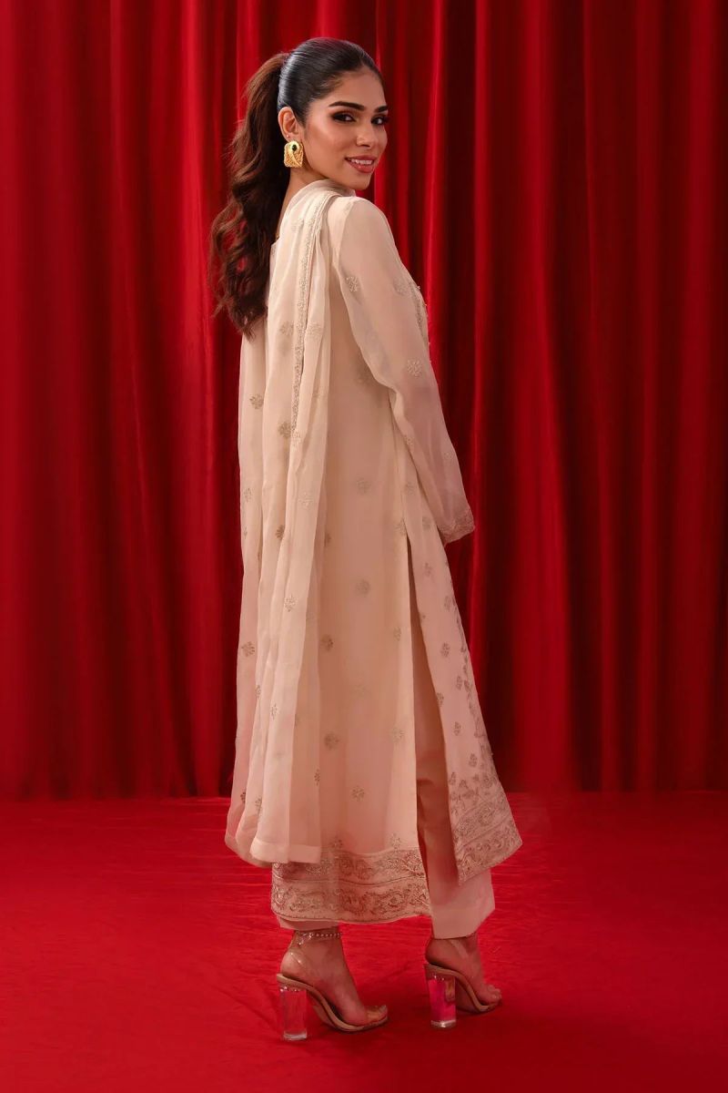 "Top: Beige Chiffon Kurta with Hand Adda Work, Sequence Embroidery and Malai Crepe Inner