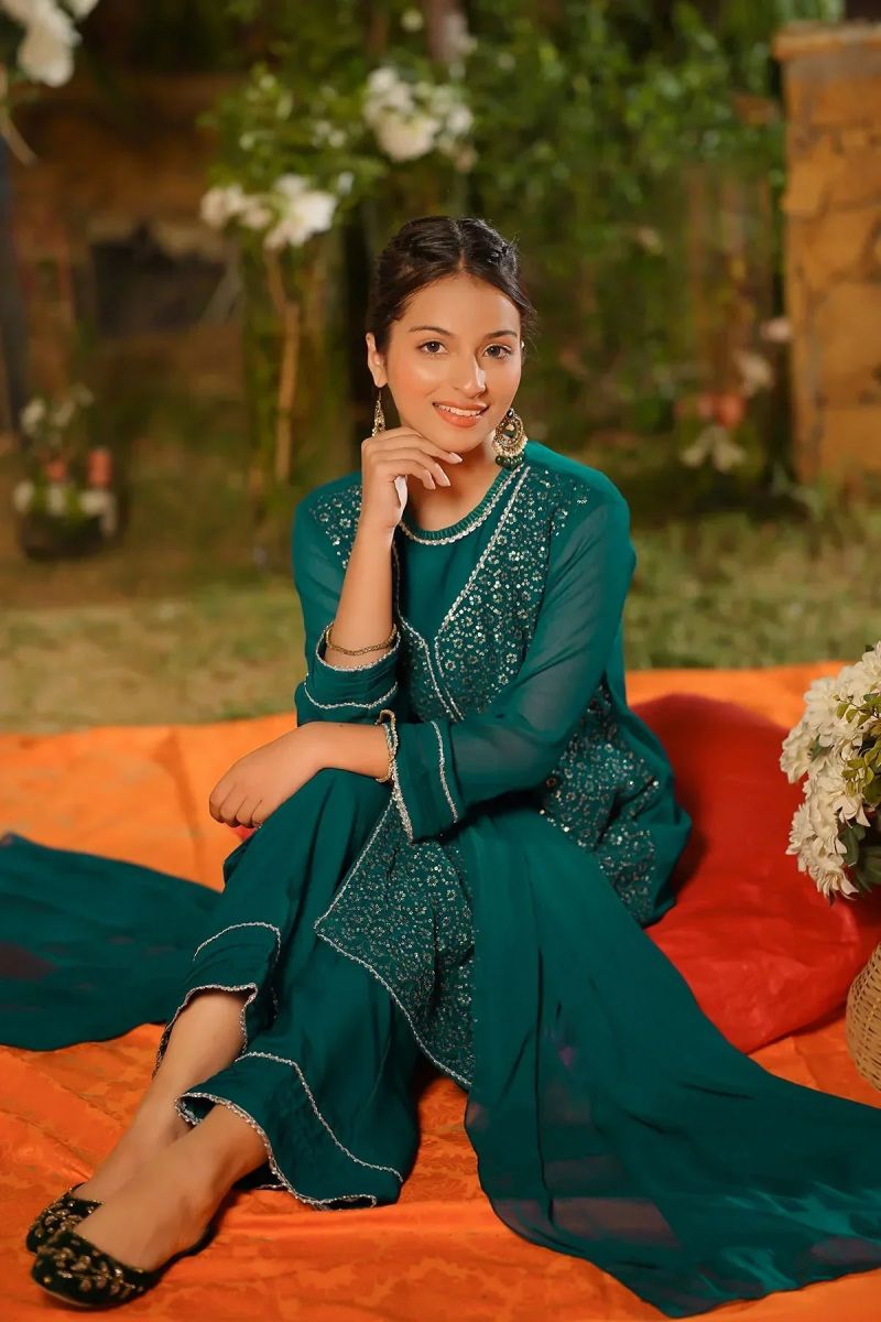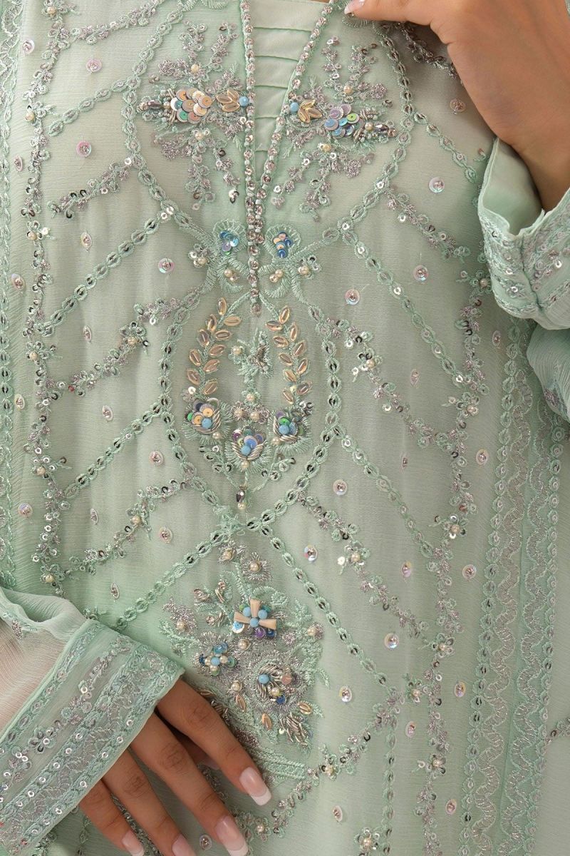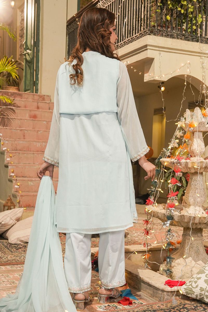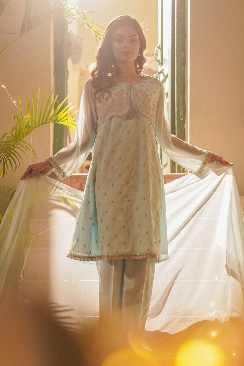 Top: Tiffany Blue Chiffon Koti + Kurta With Embroidery and Malai Crepe Lining