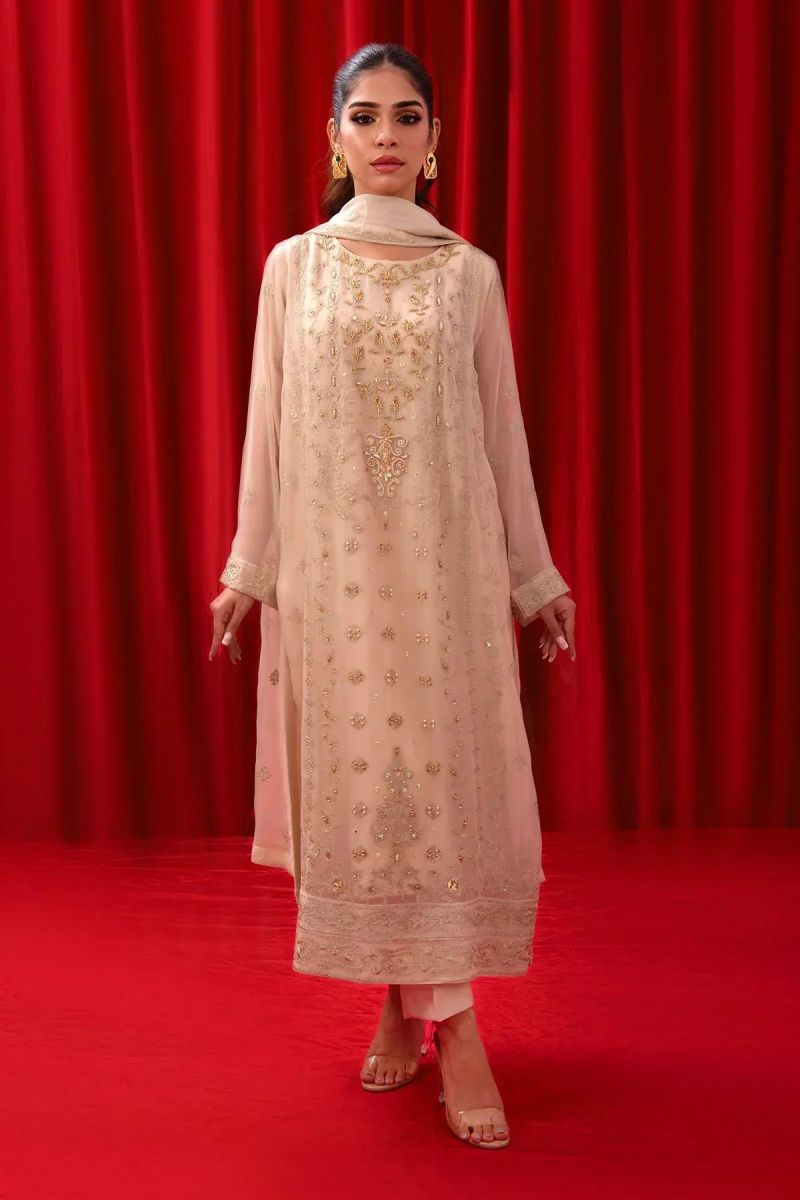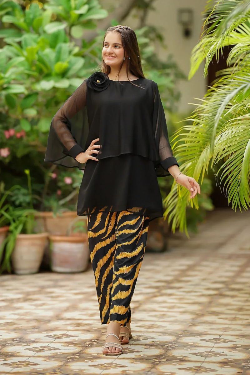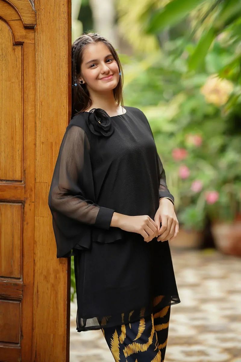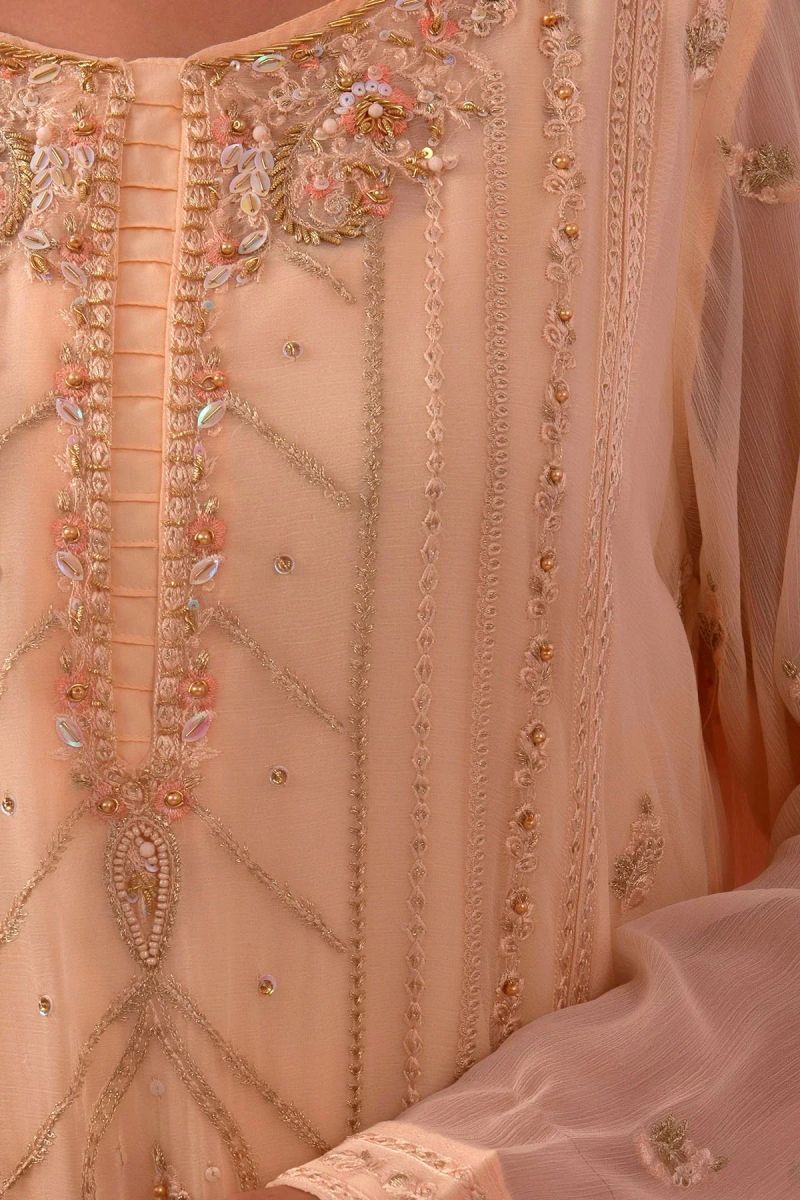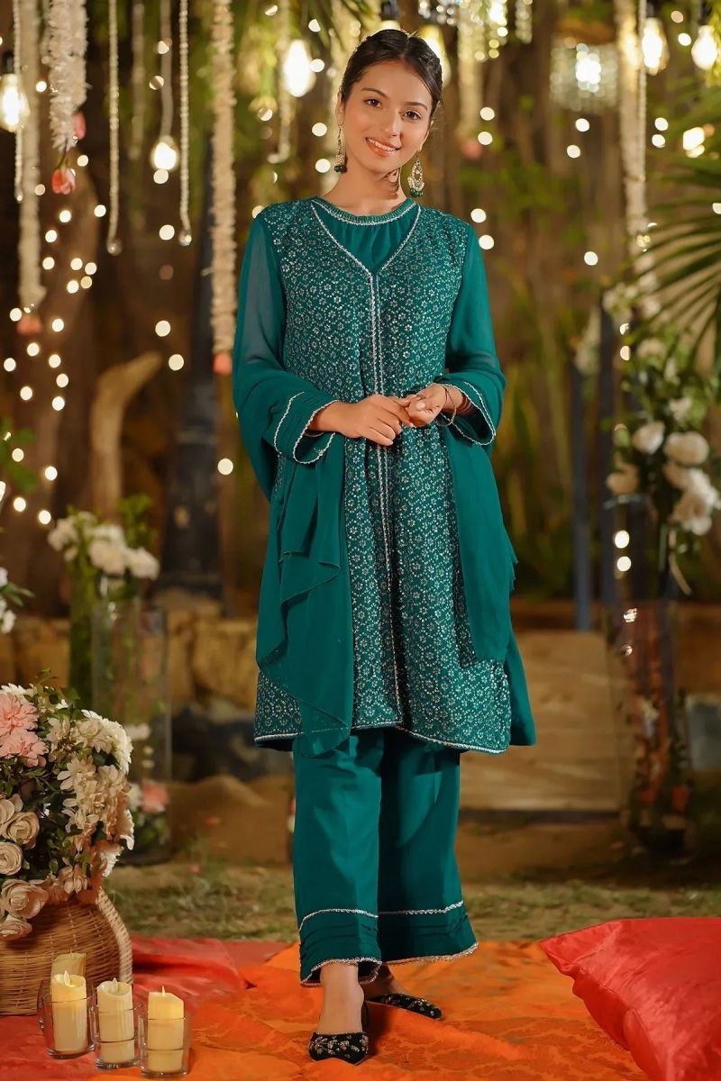 Top: Tiffany Blue Chiffon Koti + Kurta With Embroidery and Malai Crepe Lining