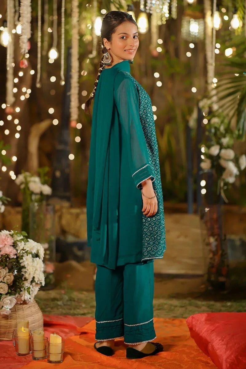 "Top: Blue Chiffon Fully Embroidered Coat Style Kurta With Laces and Stiched Malai Crepe Lining