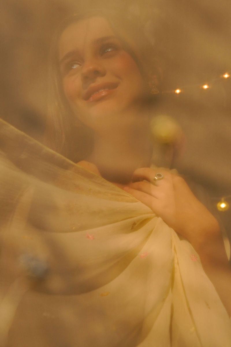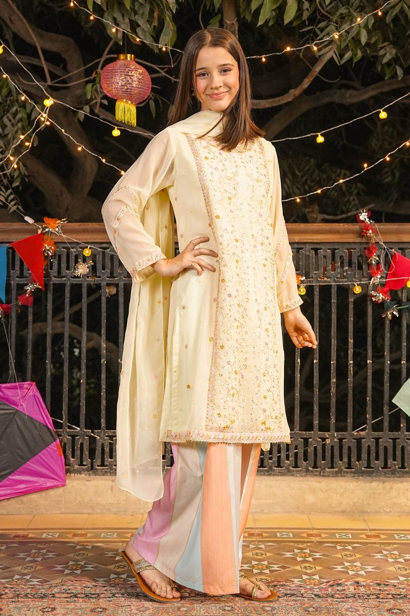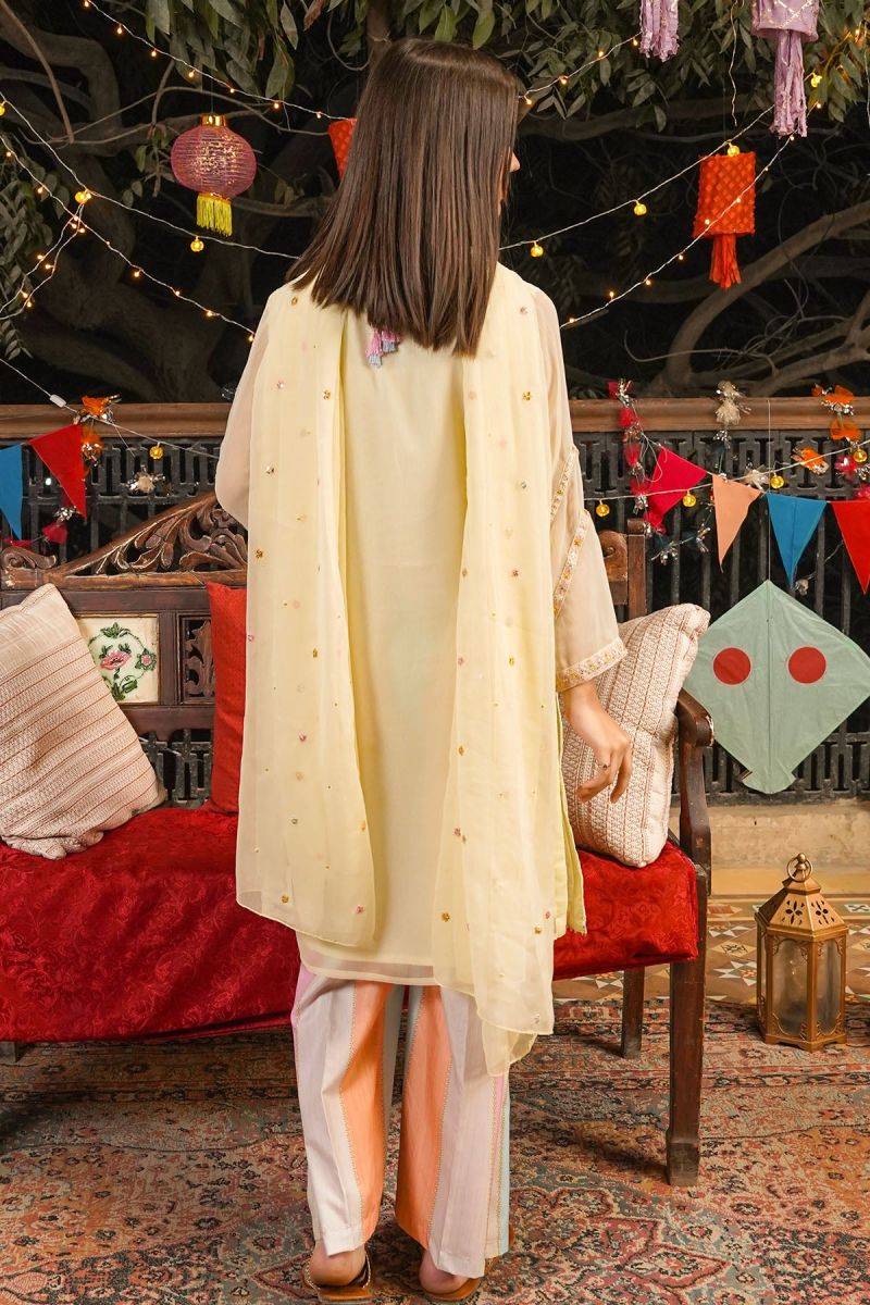 Top: Lemon Yellow Chiffon Kurta With Embroidery and Malai Crepe Lining