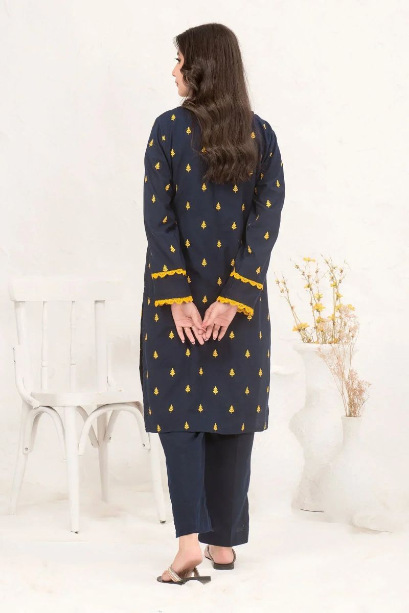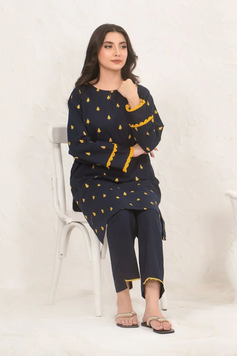 | Top: Navy Blue Cotton Embroidered Kurta Bottom: Navy Blue Cotton Trouser |