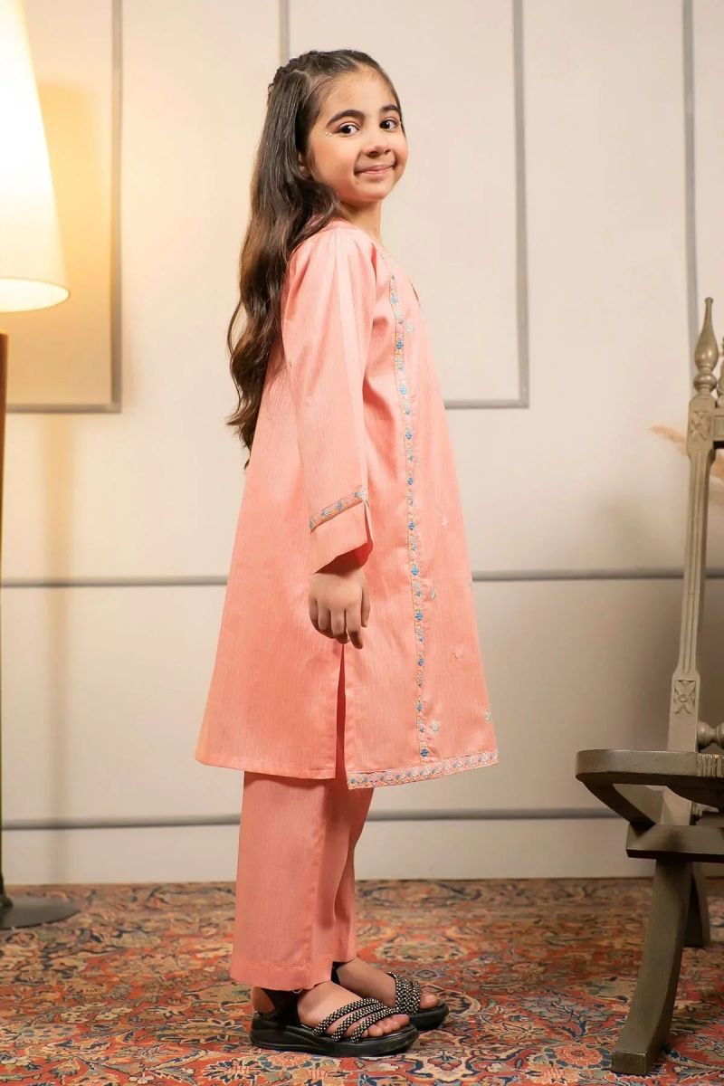 "Top: Peach Cotton Kurta with Embroidery