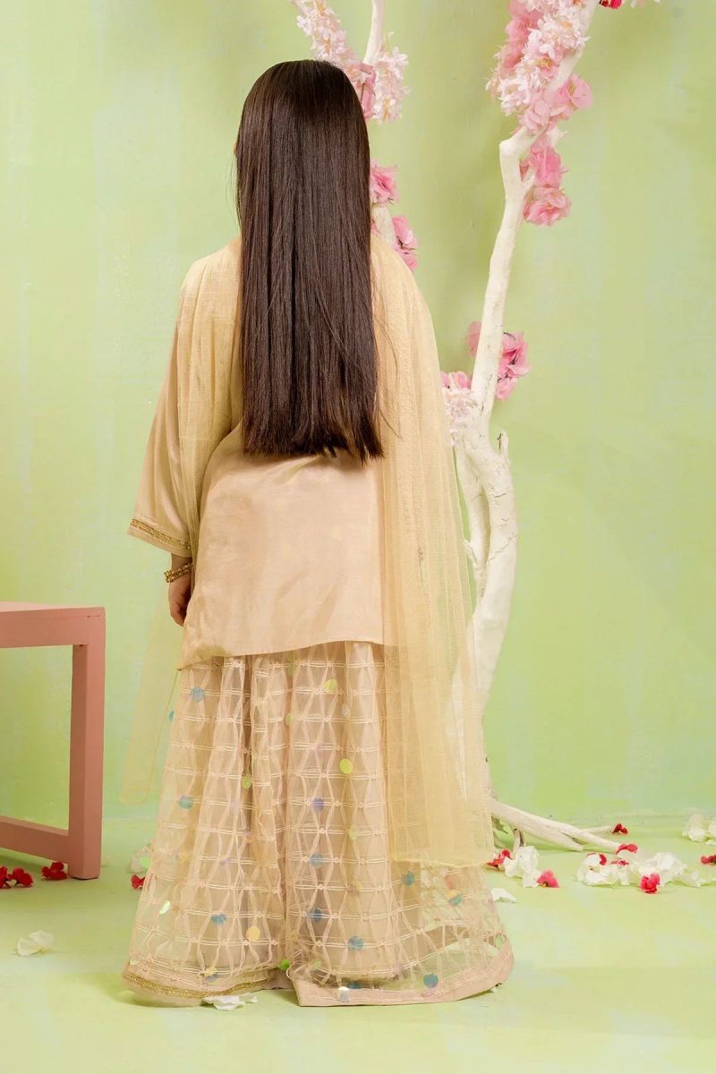 Bottom: Beige Sequence Embroidered Net Lehnga With Malai Crepe Lining