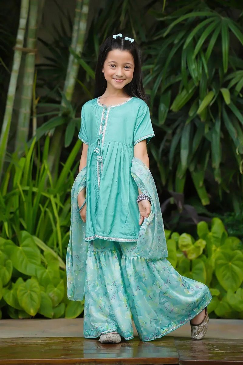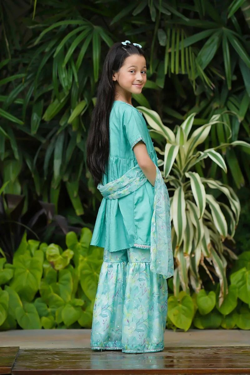 Bottom: Sea Green Printed and Sequence Net Gharara Pants With Sea Green Malai Crepe Lining