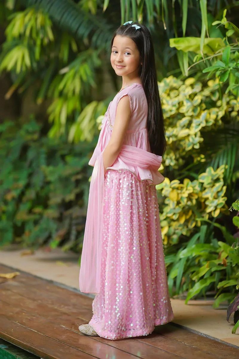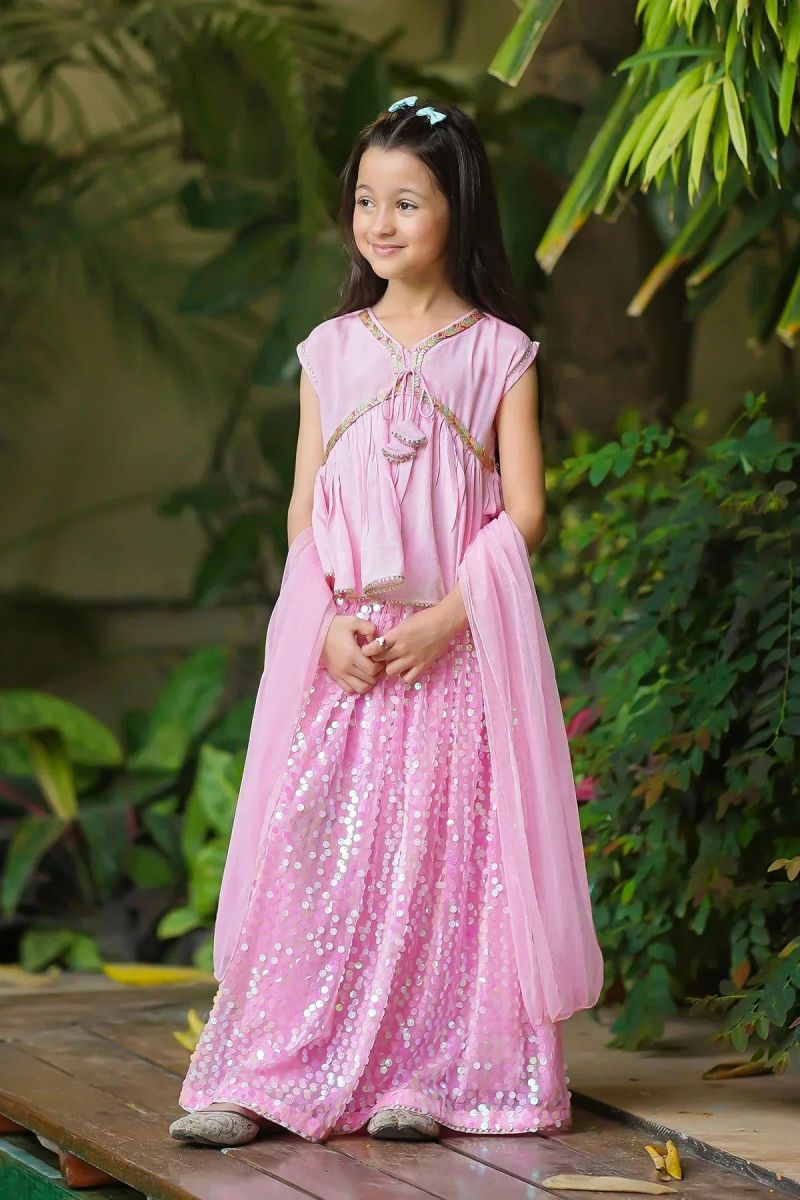 Bottom: Pink Sequence Net Lehnga With Malai Crepe Inner