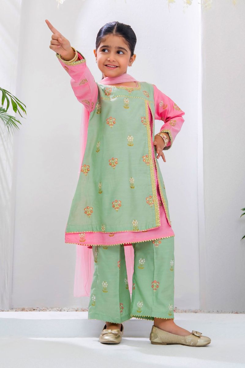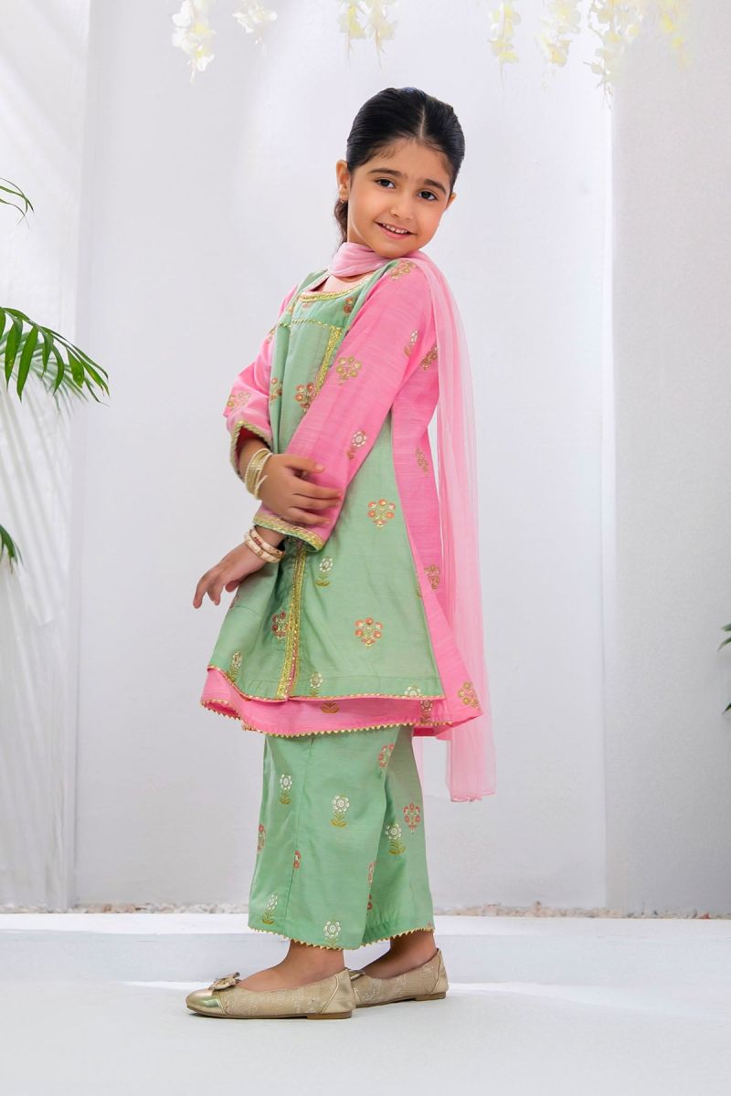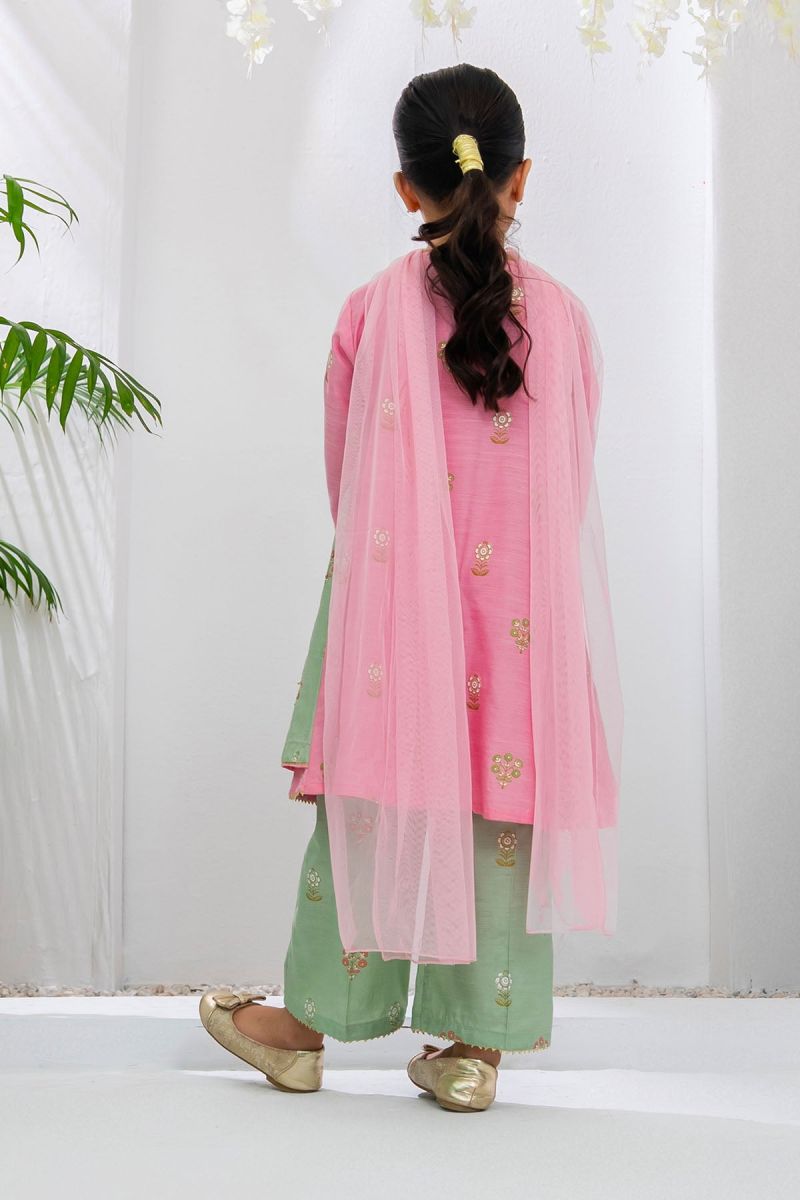 Top: Mint and Pink Cotton Silk Kurta With Screen Print and Gota Laces