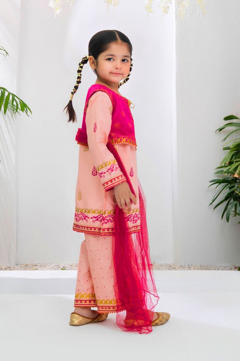Top: Peach Cotton Silk Screen Printed Kurta With Hot Pink Printed Koti and Tassels
