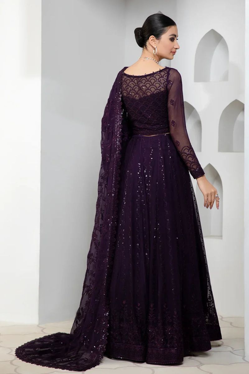 An alluring disposition of dreams, a purple surface attire is a vision to behold, as it comes paired with same-coloured sequins heavily embellished on the ethereal base. Pleasingly curated in traditional patterns and motifs of the regal era. This is paired with a matching overall embroidered dupatta and trouser.