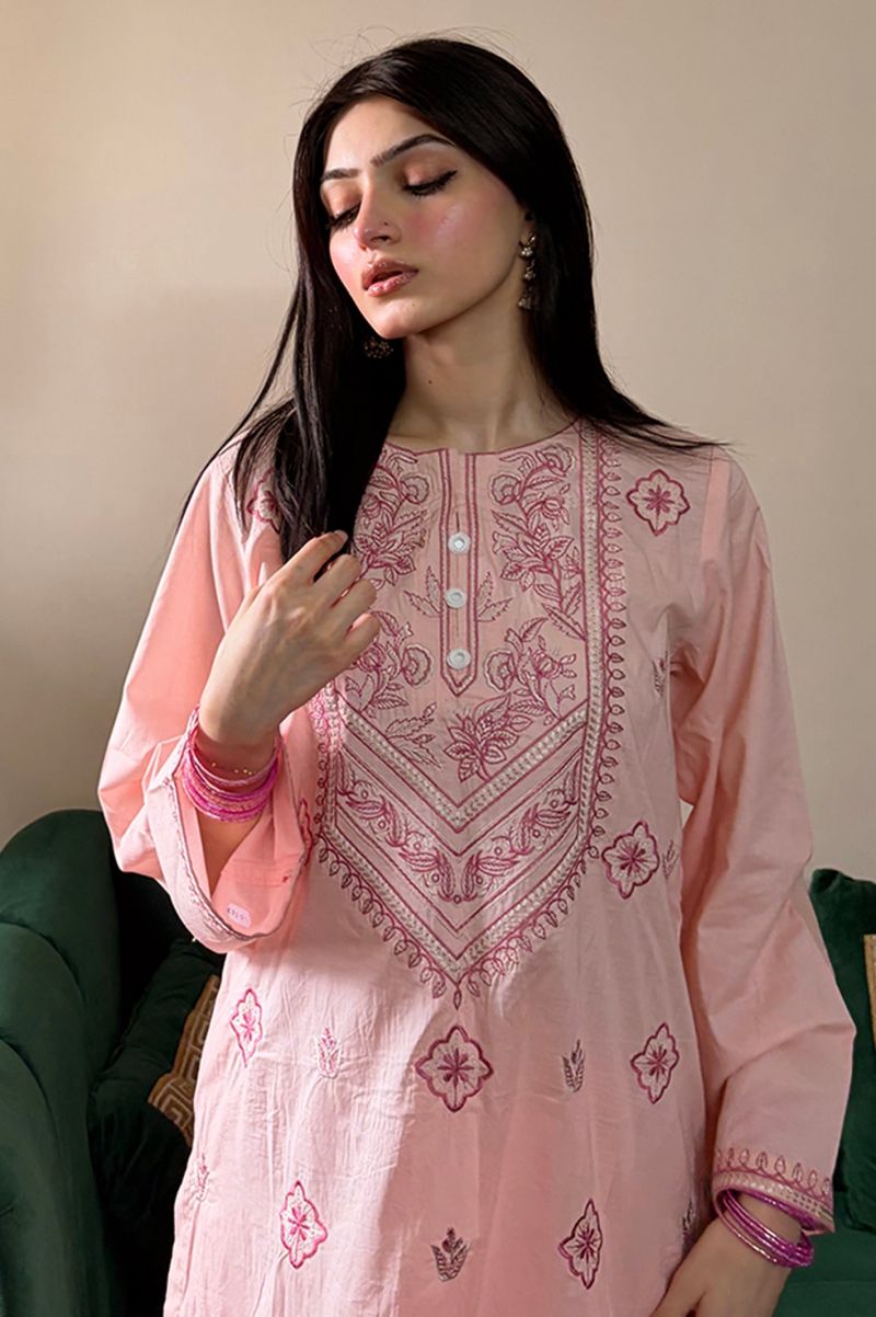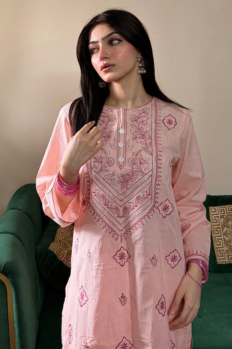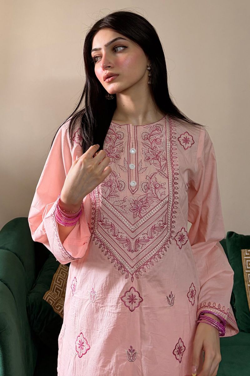 This outfit features a comfortable shirt with delicate embroidered details, paired with a flowing farshi shalwar that adds a stylish yet relaxed feel. Made from soft, breathable fabric, it keeps you cool and comfortable in warm weather. The gentle colors and neat finishing is perfect for everyday wear.