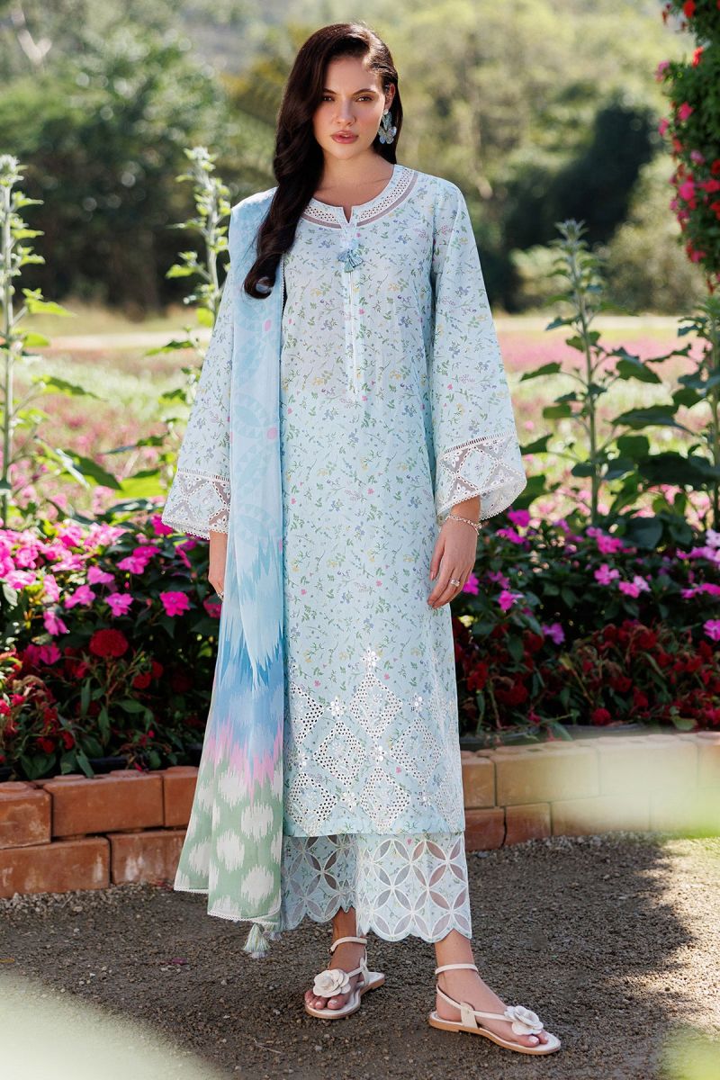 Plum 100% Cotton Lawn Peach Colour Printed Blue White Flowers Embroidered Blue threads On Stitched 2 pc suit for Girls.