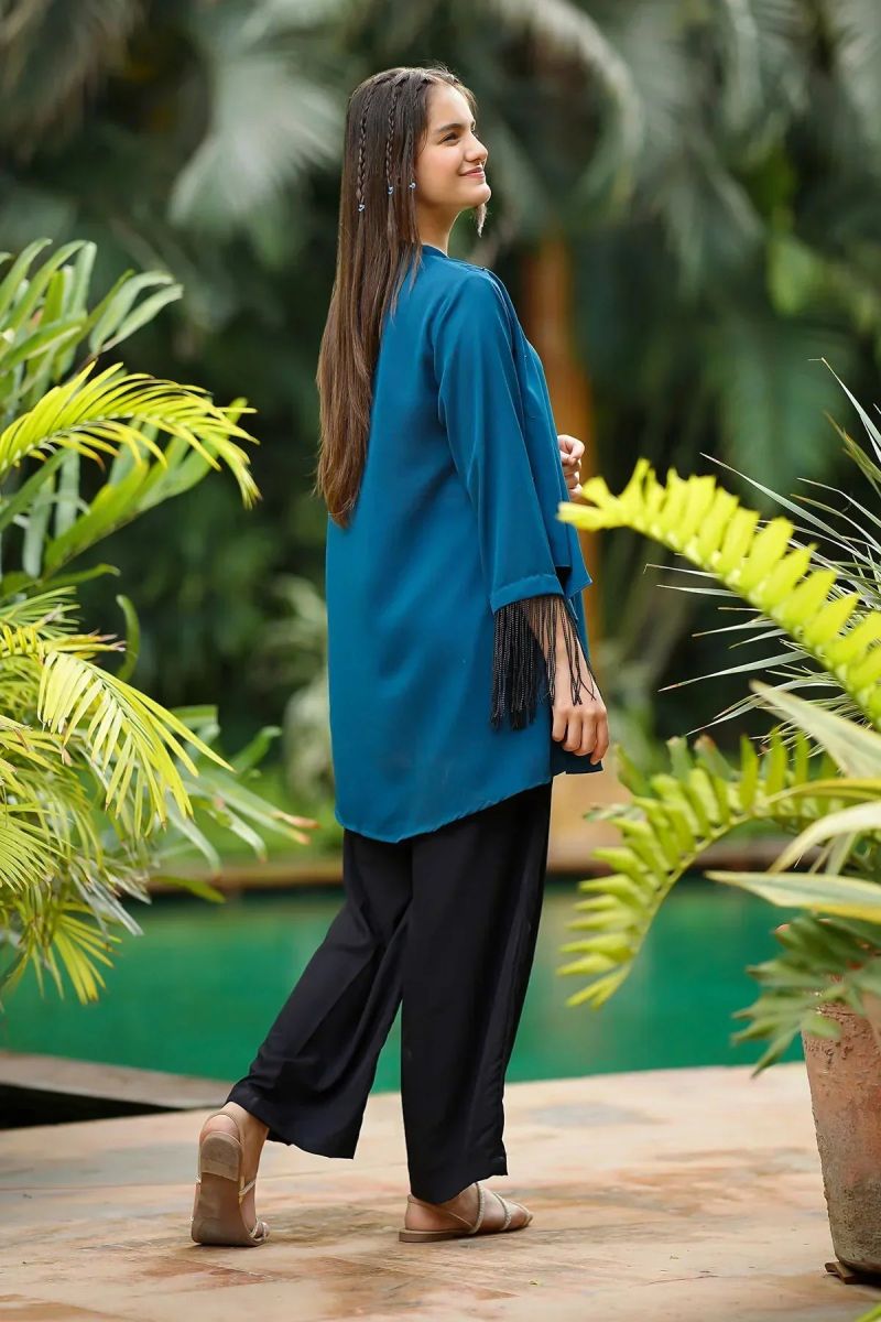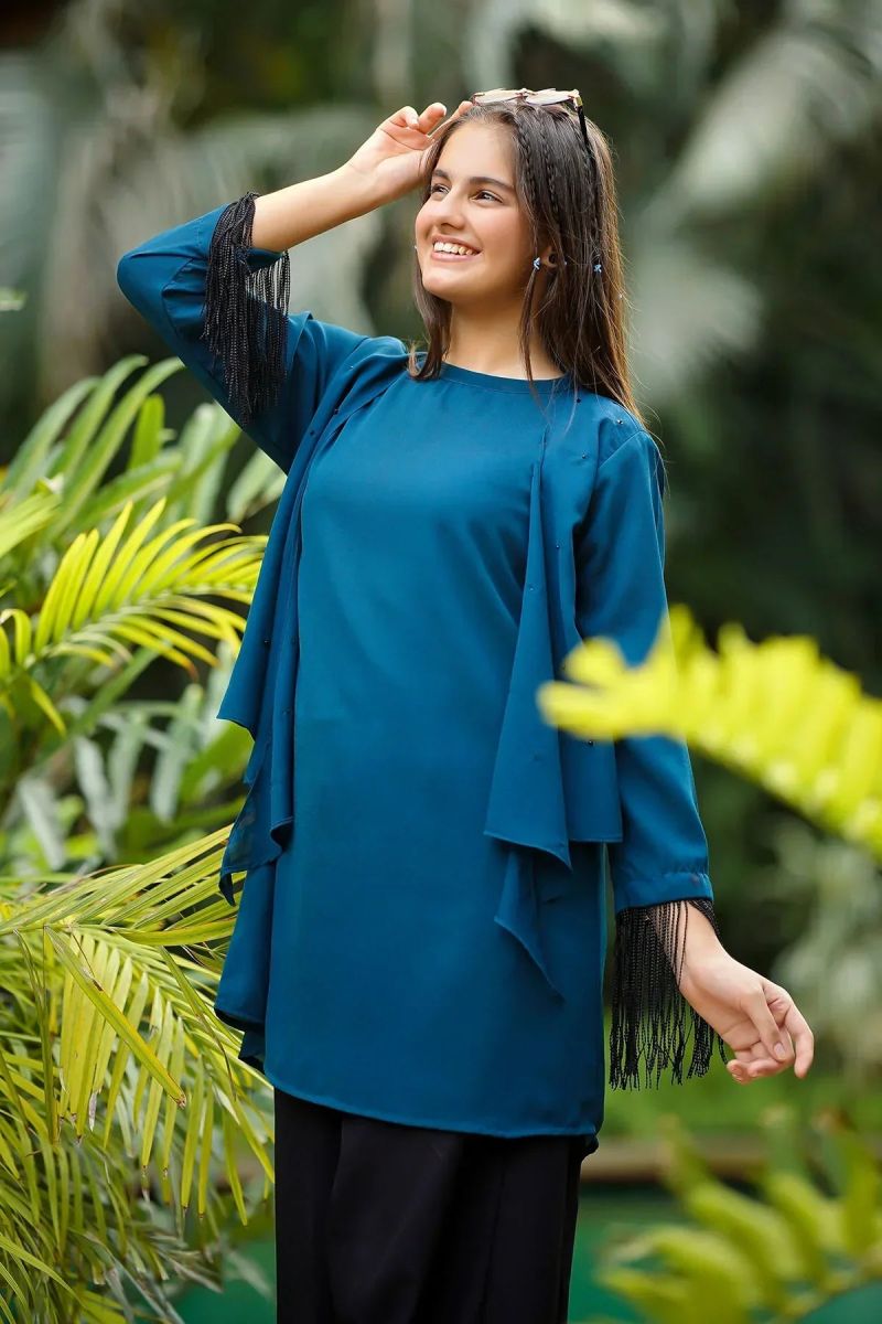 Top: Teal Blue Georgette Top With Hand Adda Work Stones