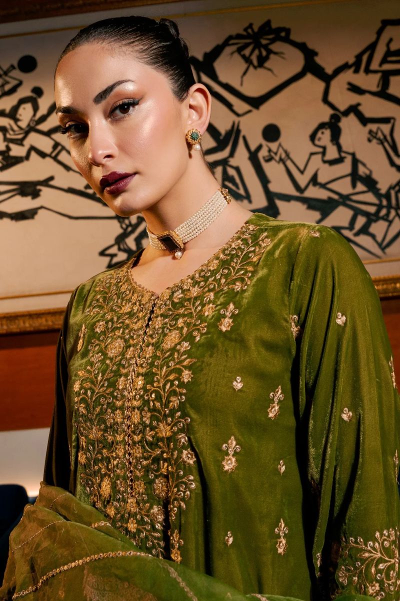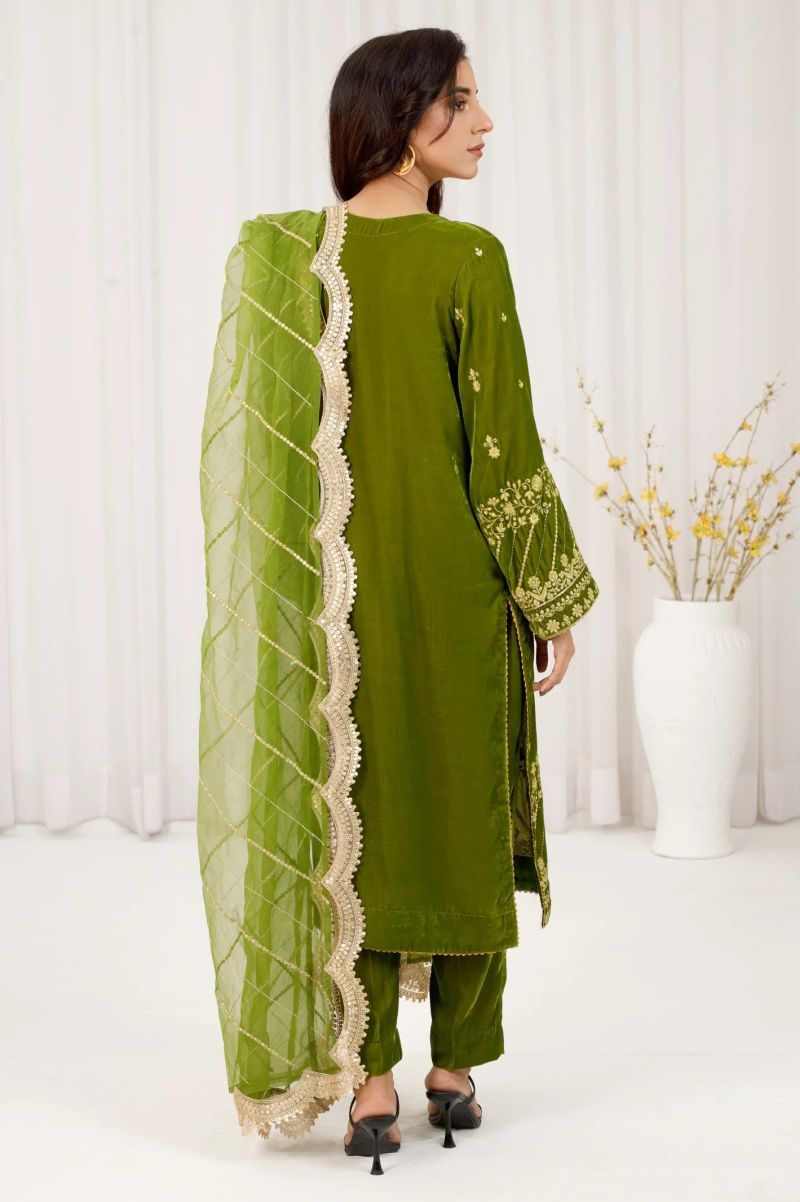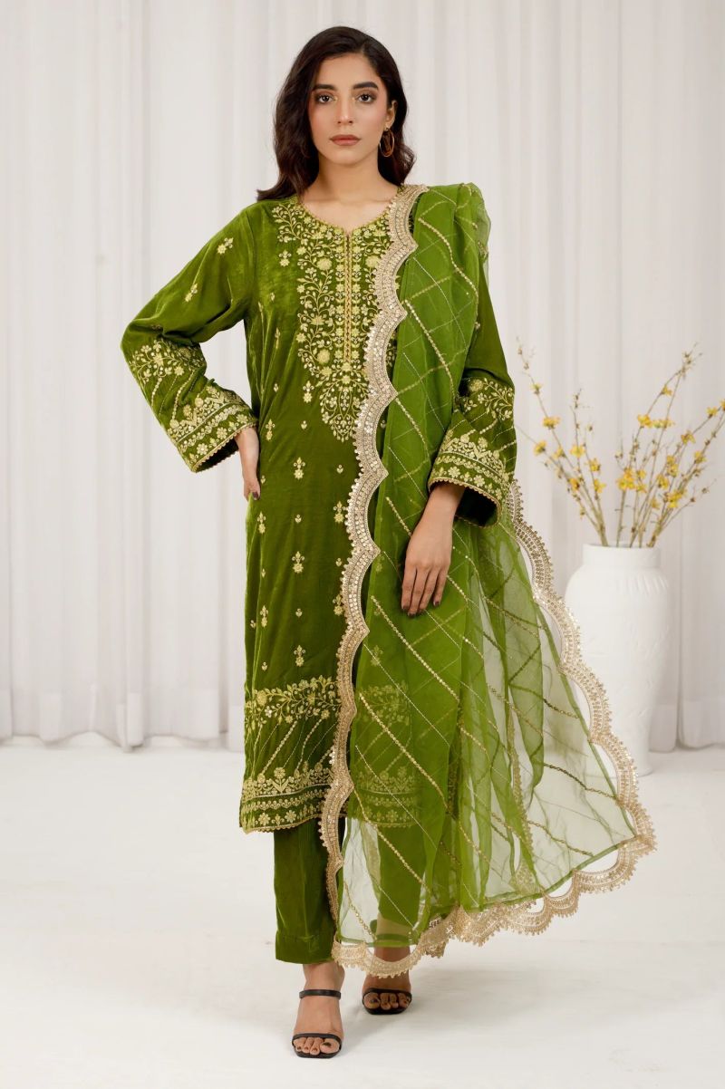 Plum 100% Cotton Lawn Green Colour Printed Yellow Green Flowers Embroidered Green threads On Stitched 2 pc suit for Girls.