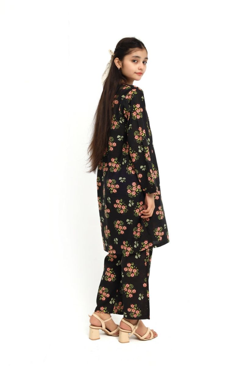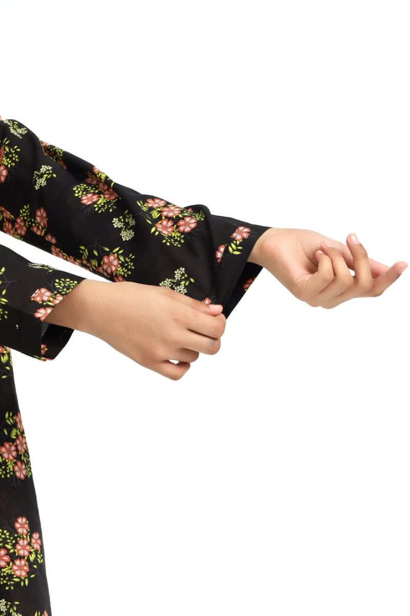 Liven up your little one's wardrobe with our Premium Quality Stitched 100% Soft Cotton Black Colour Printed with Pink Green Flowers Embroidered Off White threads on 2 pc suit ! Made from premium 100% Cotton for Autumn, this suit is not only high-quality, but also comfortable for all-day wear Casuals and Formals. Perfect for any stylish girl, this 2 pc suit is a must-have.
