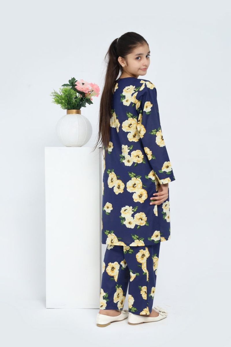 Liven up your little one's wardrobe with our Premium Quality Stitched 100% Soft Cotton Dark Blue Colour Printed with Yellow Green Flowers Embroidered Yellow threads on 2 pc suit ! Made from premium 100% Cotton for Autumn, this suit is not only high-quality, but also comfortable for all-day wear Casuals and Formals. Perfect for any stylish girl, this 2 pc suit is a must-have.