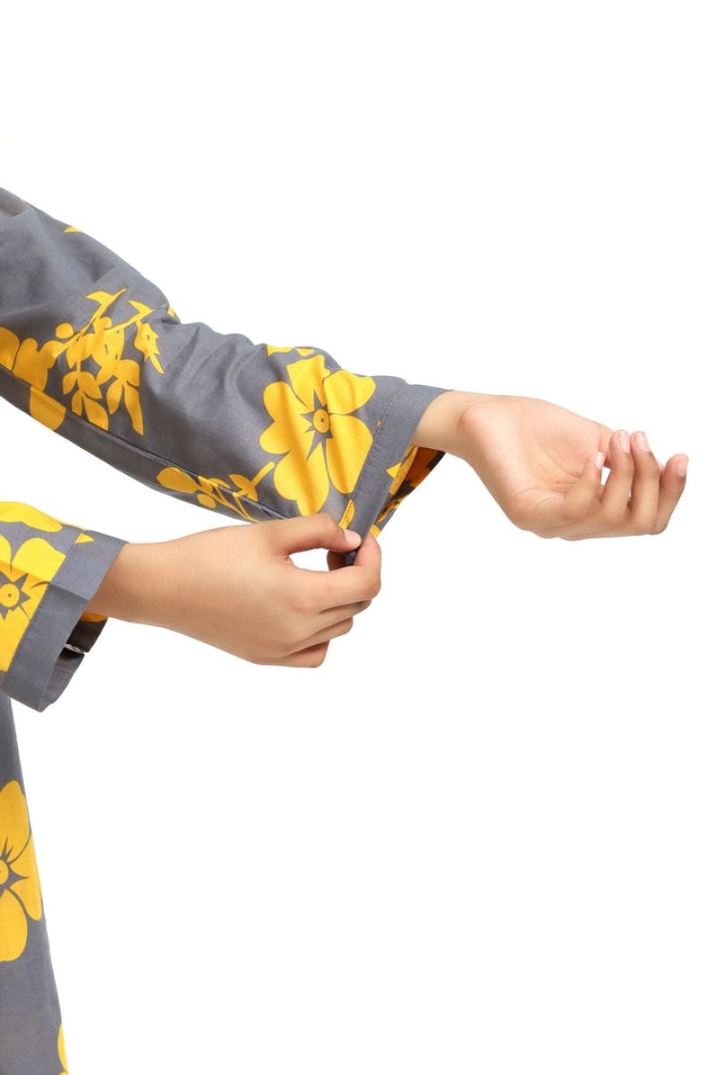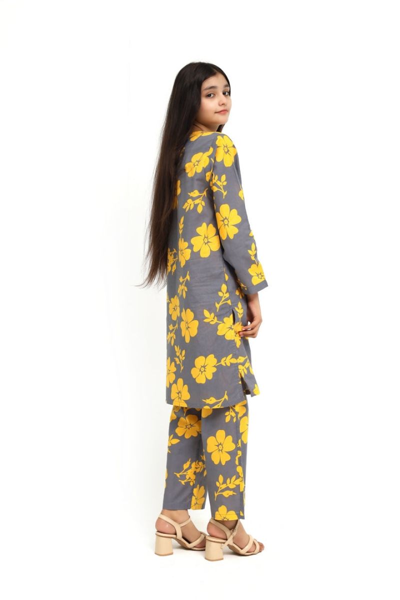 Liven up your little one's wardrobe with our Premium Quality Stitched 100% Soft Cotton Grey Colour Printed with Yellow Flowers Embroidered Off White threads on 2 pc suit ! Made from premium 100% Cotton for Autumn, this suit is not only high-quality, but also comfortable for all-day wear Casuals and Formals. Perfect for any stylish girl, this 2 pc suit is a must-have.
