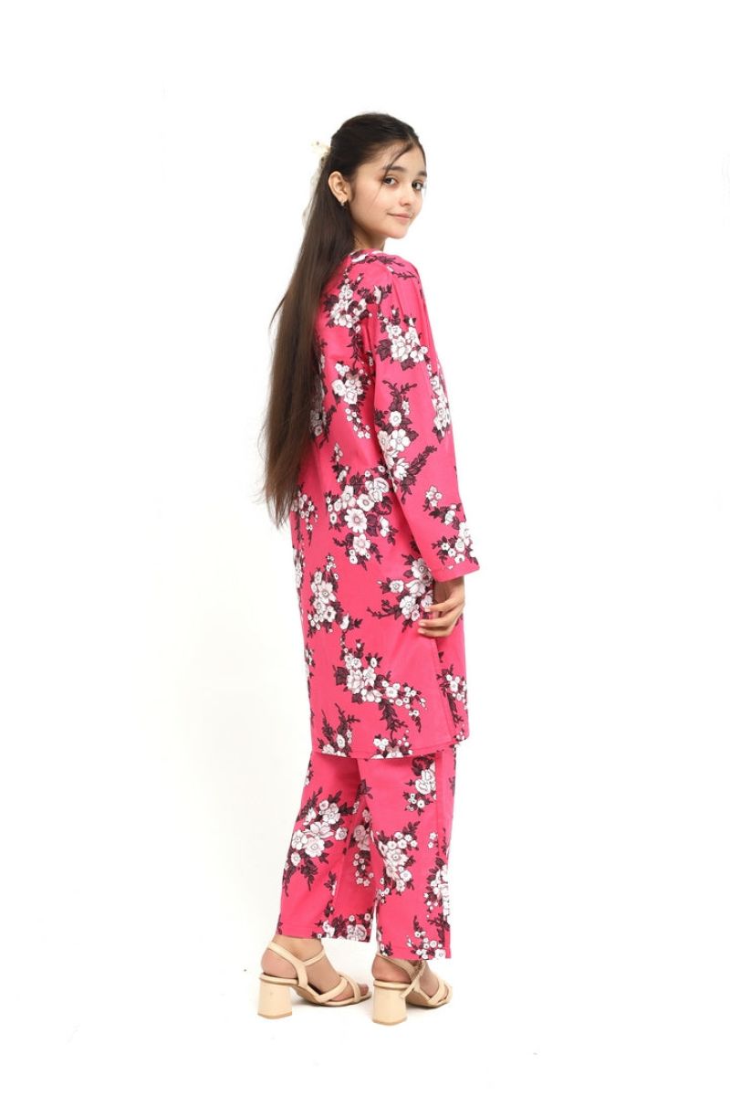 Liven up your little one's wardrobe with our Premium Quality Stitched 100% Soft Cotton Pink Colour Printed with White Burgundy Flowers Embroidered Off White threads on 2 pc suit ! Made from premium 100% Cotton for Autumn, this suit is not only high-quality, but also comfortable for all-day wear Casuals and Formals. Perfect for any stylish girl, this 2 pc suit is a must-have.