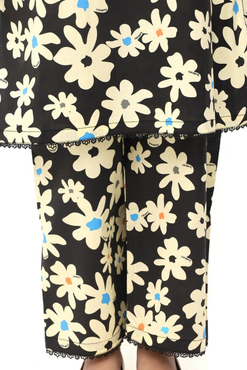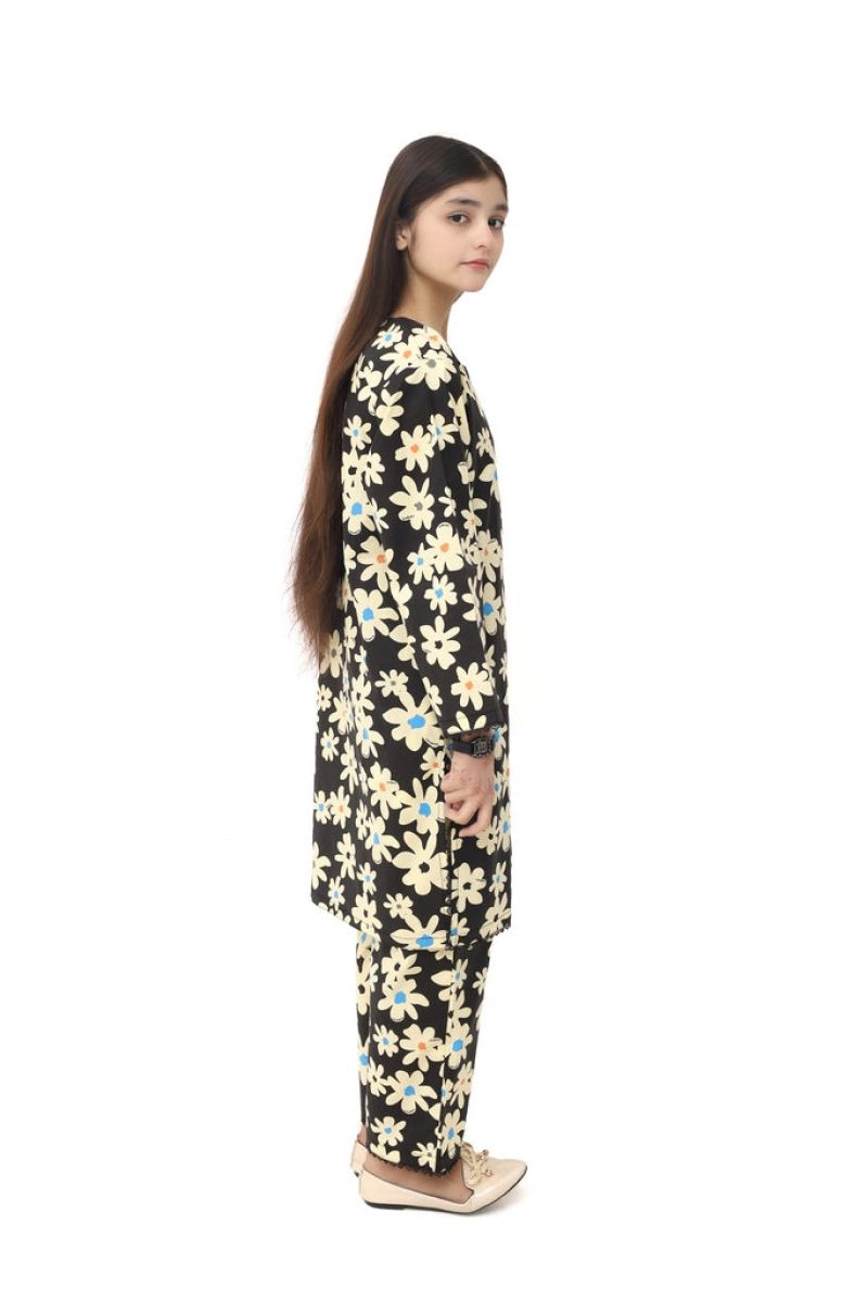 A beautiful two-piece suit perfect for your little girl! Made from soft, breathable 100% cotton lawn fabric in a classic black color. The outfit features pretty off-white flowers printed all over, with delicate off-white tassels and black laces adding extra charm. The suit comes fully stitched and ready to wear, making it ideal for special occasions, family gatherings, or everyday wear. Comfortable, stylish, and designed to make her feel special!