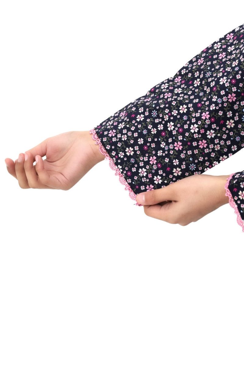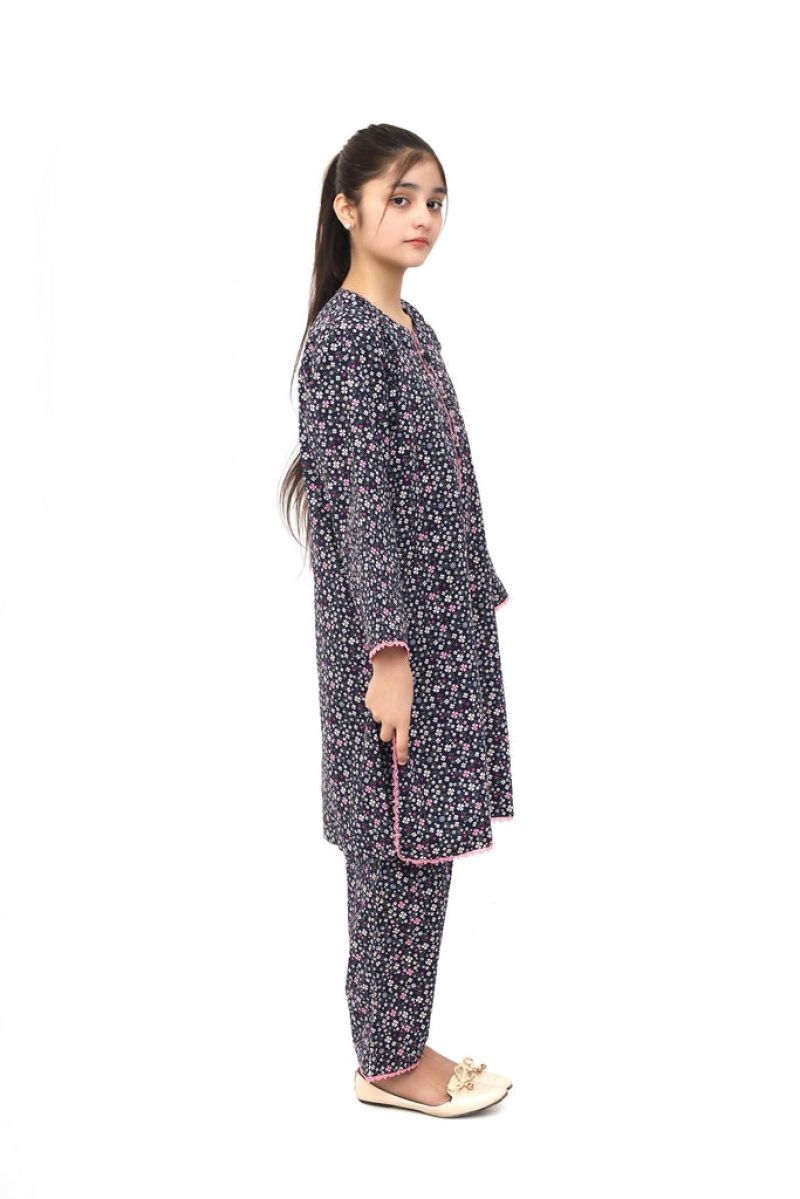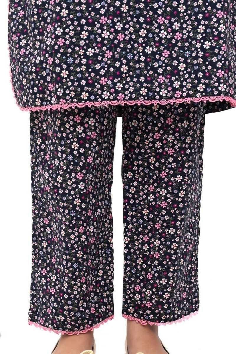Stunning two-piece stitched suit for girls featuring premium cotton lawn in elegant black with vibrant digital floral prints in pink, purple, and blue. Adorned with eye-catching black tassels and pink laces for a trendy touch. Ready to wear and perfect for parties, weddings, or special moments.