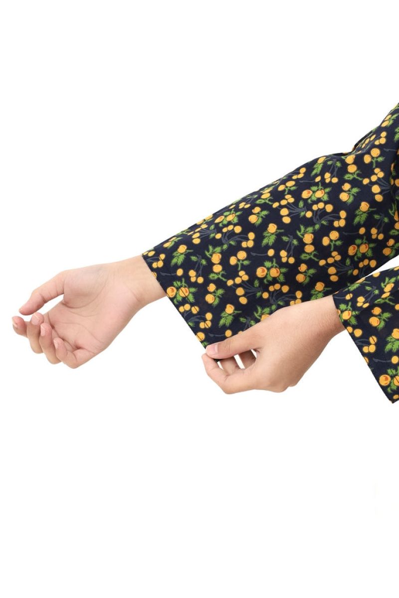 Discover timeless charm in this delightful 2-piece stitched suit featuring a sophisticated dark blue base adorned with deep yellow and green flower prints. Crafted from breathable 100% cotton lawn, it's designed for comfort and style without any hassle. The pre-stitched construction means she can slip into elegance instantly. A versatile choice that works beautifully for everyday wear or special occasions, blending playful patterns with understated sophistication.