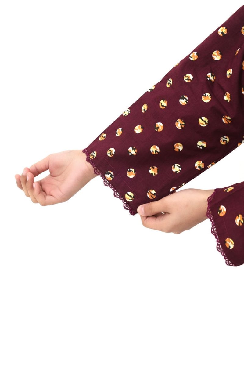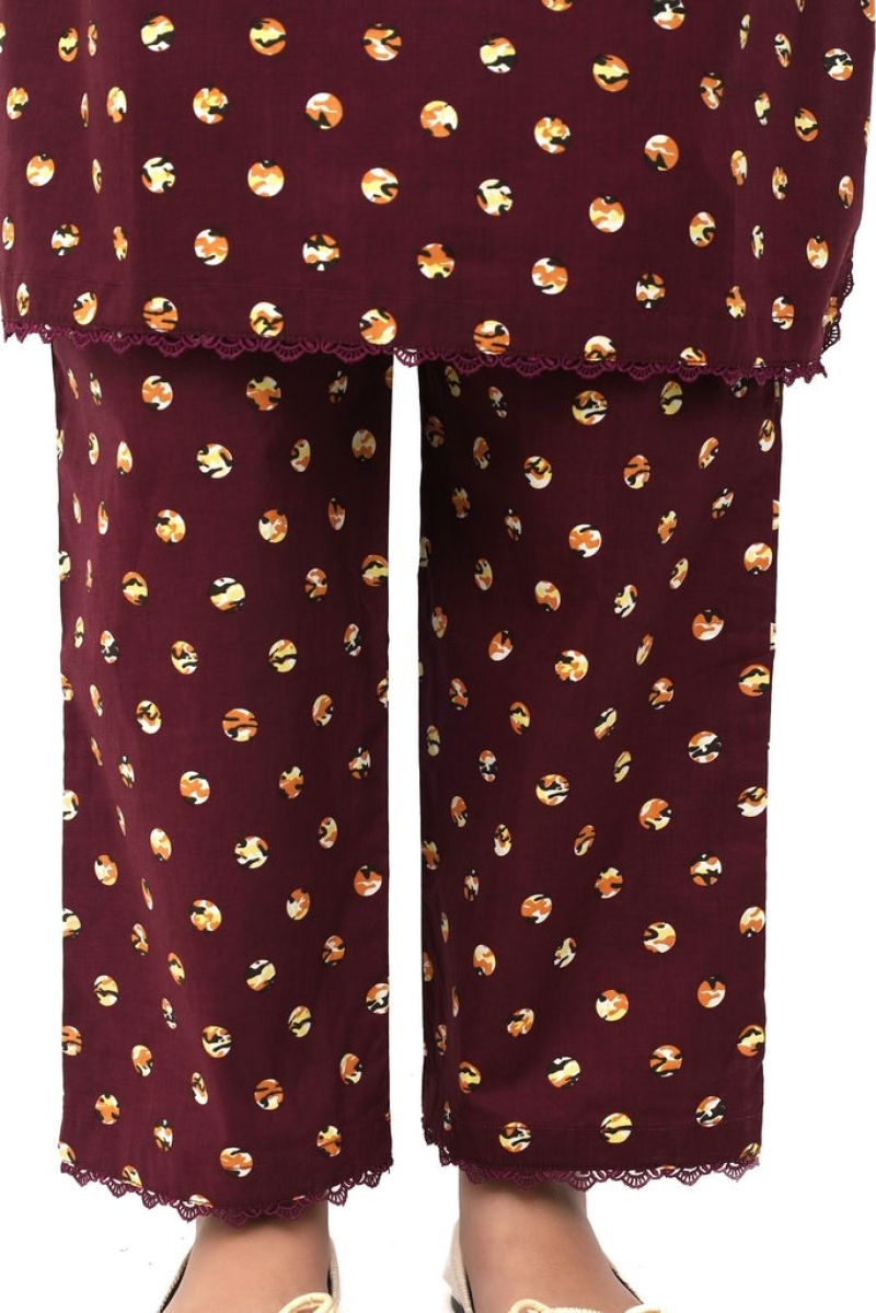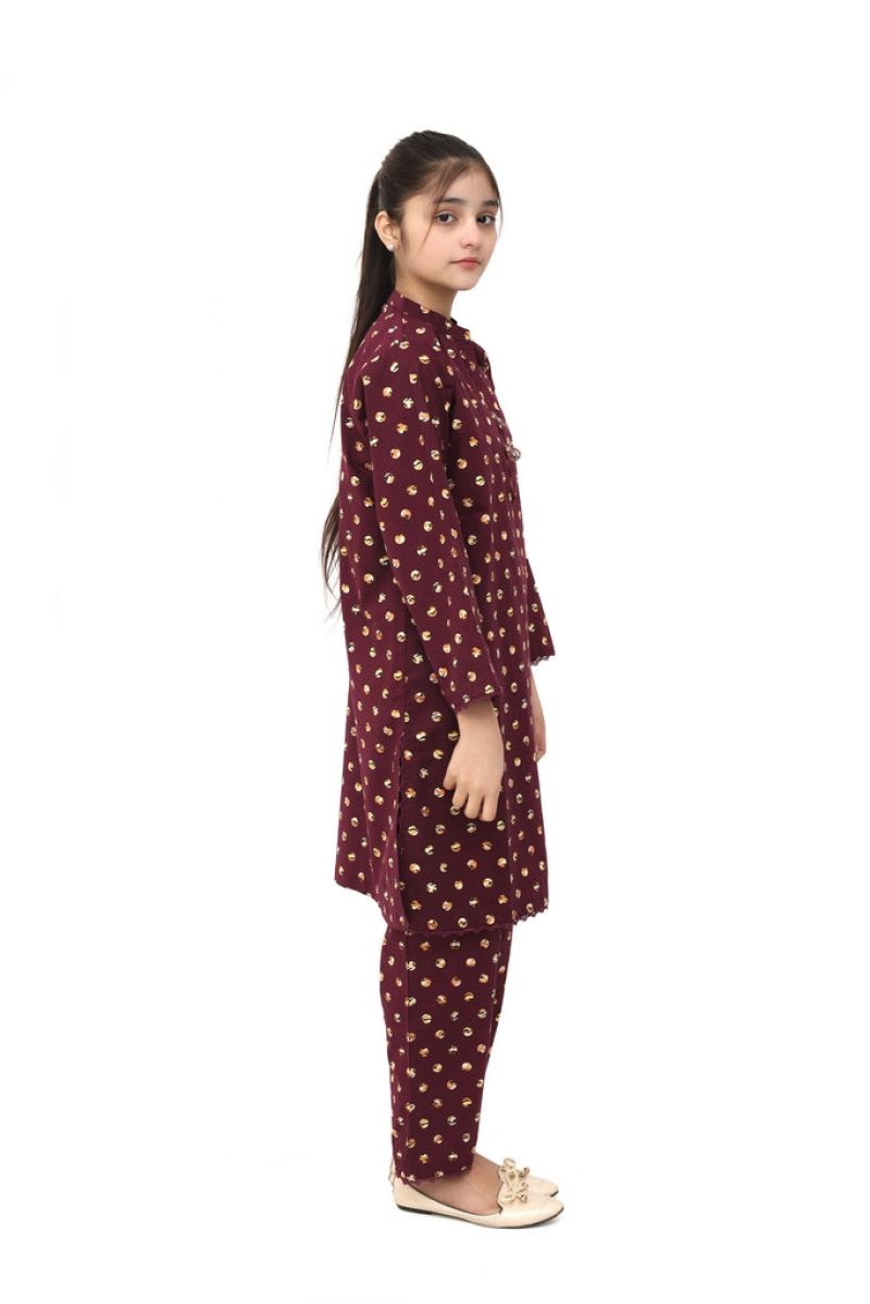 Elegant two-piece stitched suit for girls crafted from soft cotton lawn in rich dark purple. Features sophisticated digital prints of white and yellow patterns that add visual interest. Finished with coordinating purple tassels and laces for refined detailing. Pre-stitched and ready to wear for any occasion. Comfort meets understated elegance!