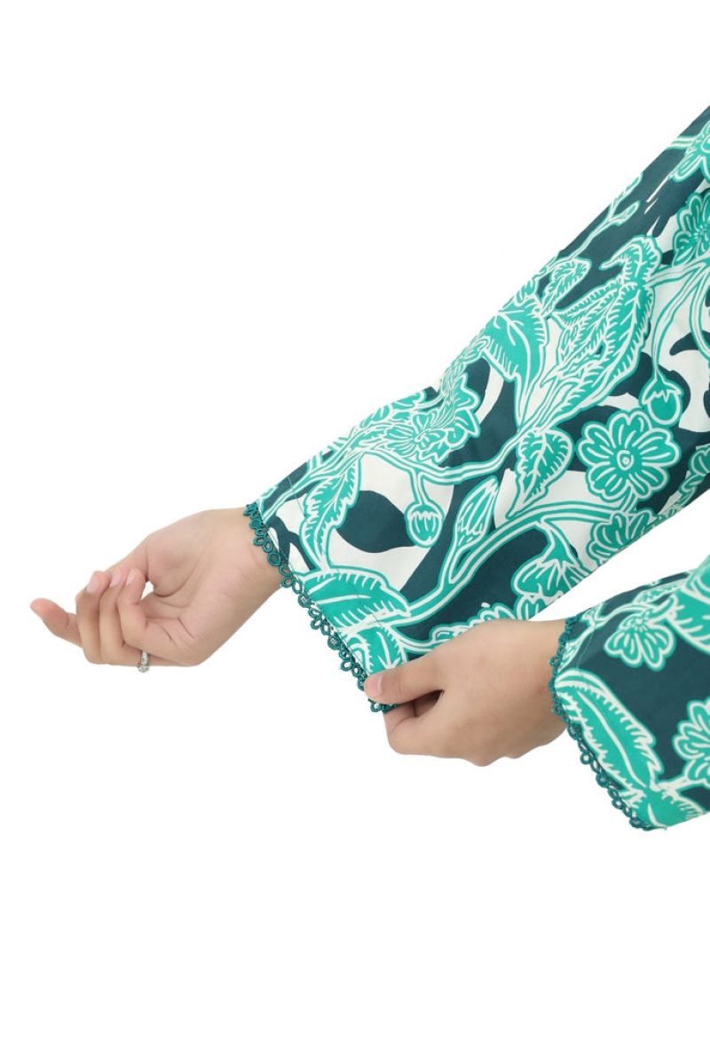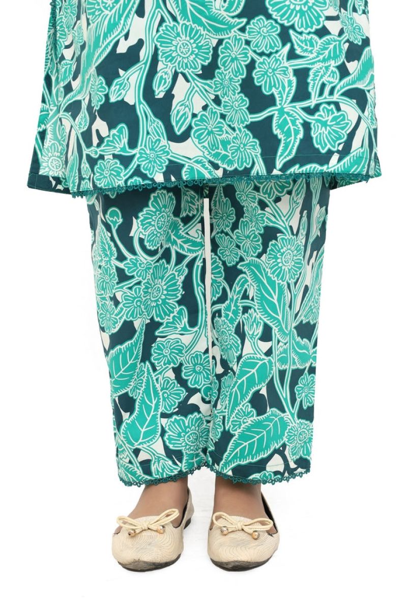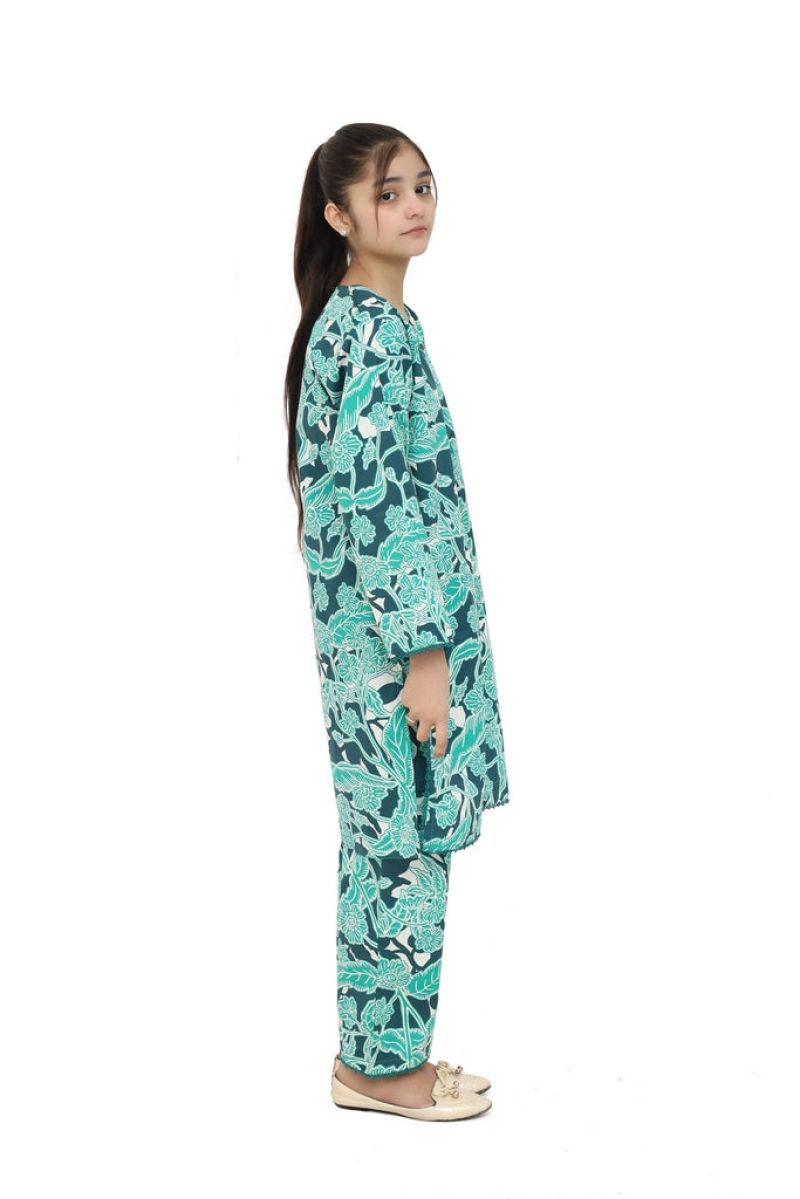 Lovely two-piece stitched suit for girls in soft green cotton lawn with delicate white and light green digital patterns. Enhanced with matching green tassels and laces for a harmonious, put-together look. Comfortable and nature-inspired, this gentle design is perfect for everyday adventures or special moments that celebrate her playful spirit.
