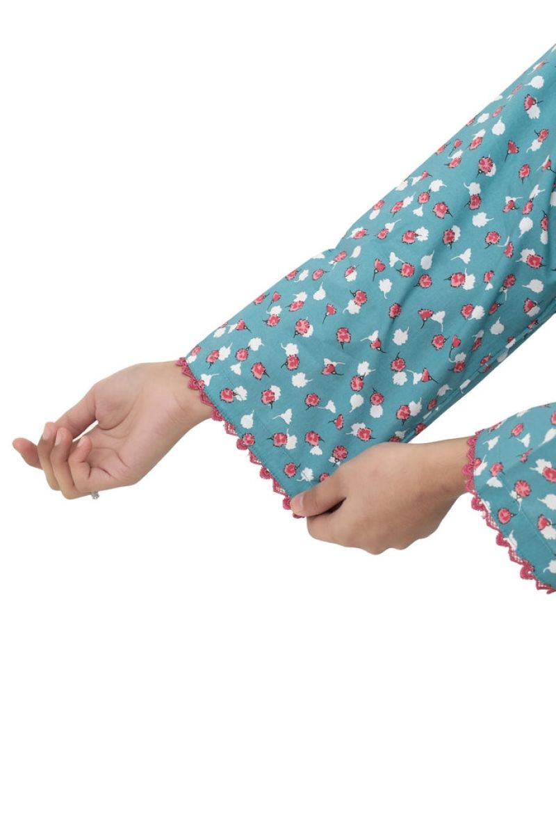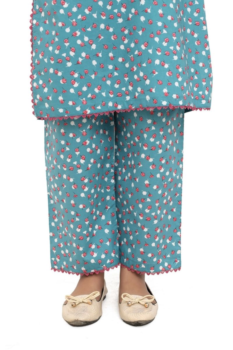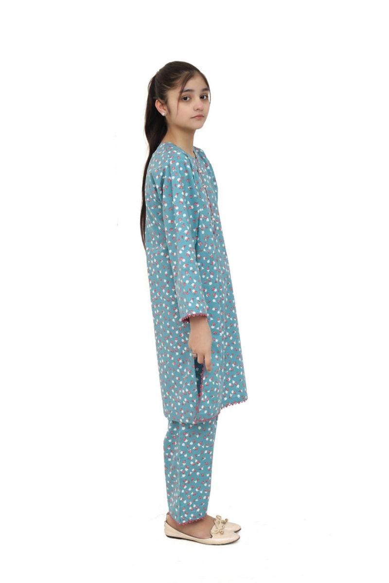 Sweet two-piece stitched suit for girls in soft green cotton lawn showcasing beautiful white and pink floral digital prints. Embellished with delicate white tassels and pretty pink laces that add a feminine touch. Comfortable and charming, this blooming design is perfect for making her feel like a little princess at any occasion.
