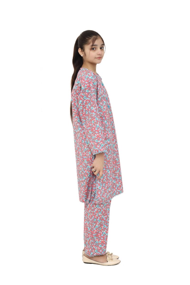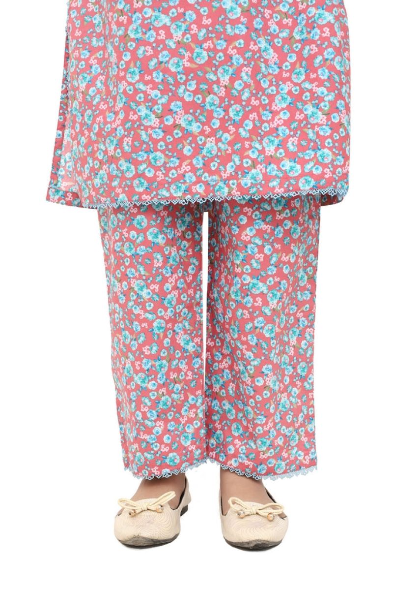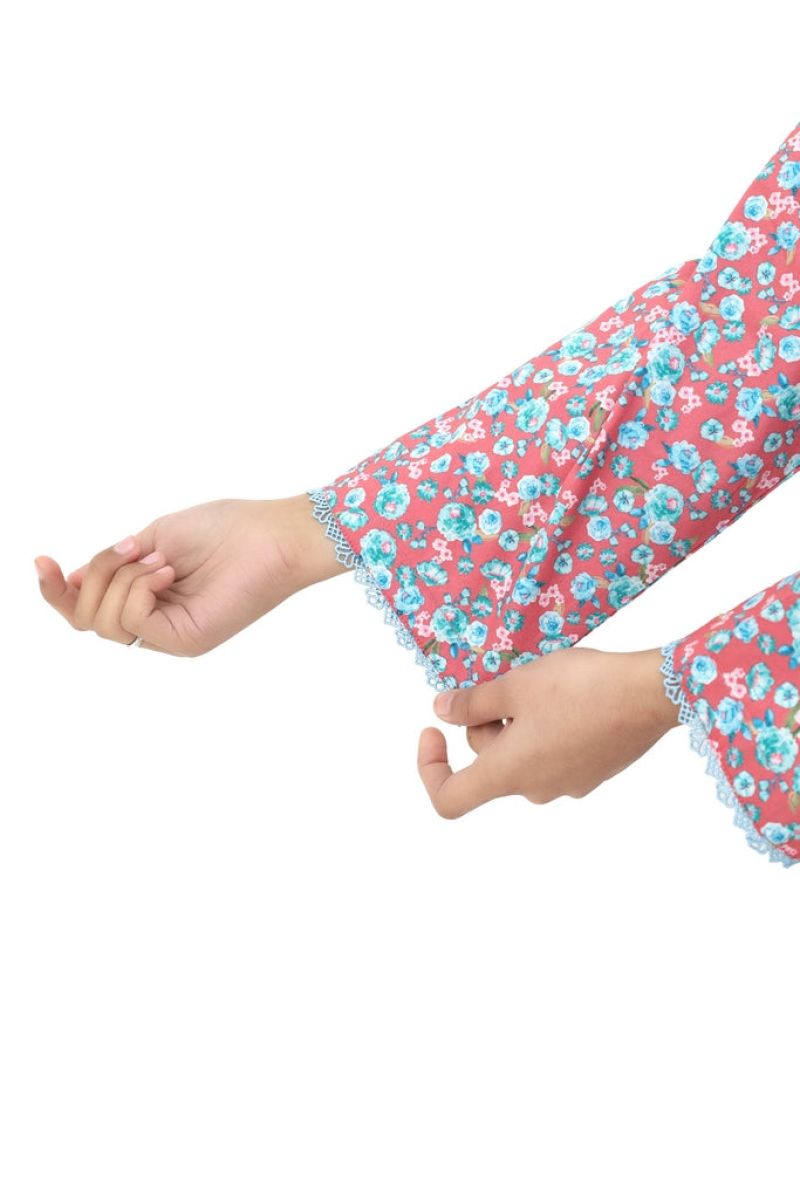 Peachy-keen two-piece stitched suit for girls in warm peach cotton lawn adorned with colorful pink, green, and sky blue floral digital prints. Finished with pretty blue tassels and laces for a coordinated, cheerful look. Comfortable and vibrant, this multi-colored design is perfect for making her feel bright and beautiful at any occasion.