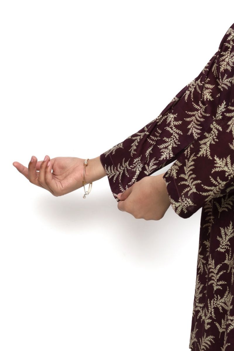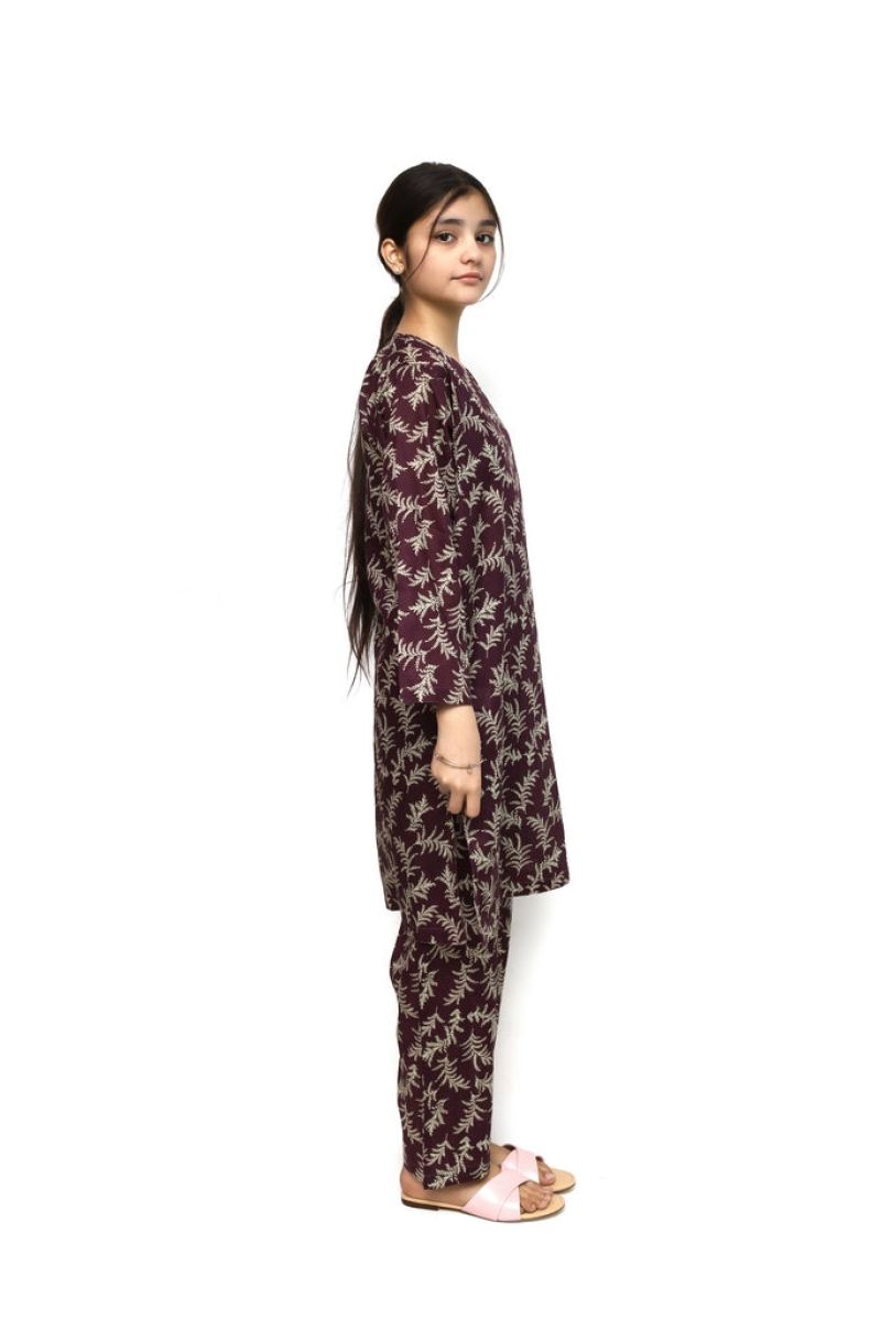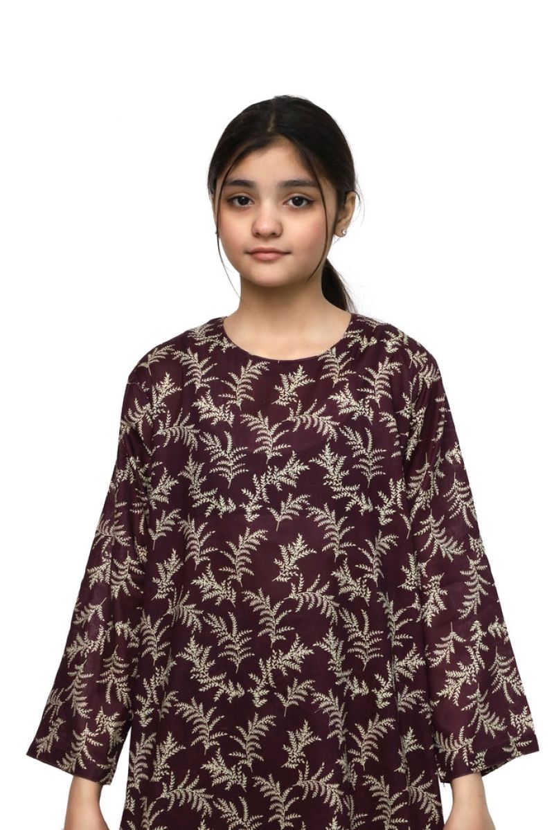 Elegant 2-piece stitched suit crafted from premium digital lawn fabric in rich maroon with delicate beige leaf prints. Perfect for young girls, this ready-to-wear ensemble combines comfort with contemporary style. The beautifully printed design adds a sophisticated touch, making it ideal for casual wear, family gatherings, or special occasions. Quality stitching ensures durability and a flattering fit. A versatile addition to any girl's wardrobe.