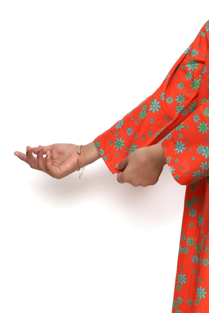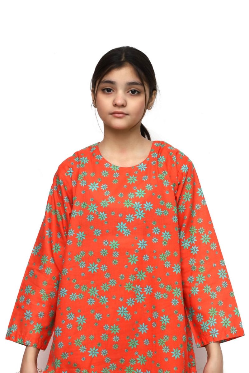 Stunning 2-piece stitched suit crafted from premium digital lawn fabric in rich orange. Features intricate floral prints in shades of green and sea green that bring elegance and charm. Pre-stitched for immediate wear with a comfortable, flattering fit. Perfect for celebrations, casual outings, or everyday style. The vibrant color combination and detailed floral design make it a standout choice for young girls. Durable, breathable fabric ensures all-day comfort and easy care.